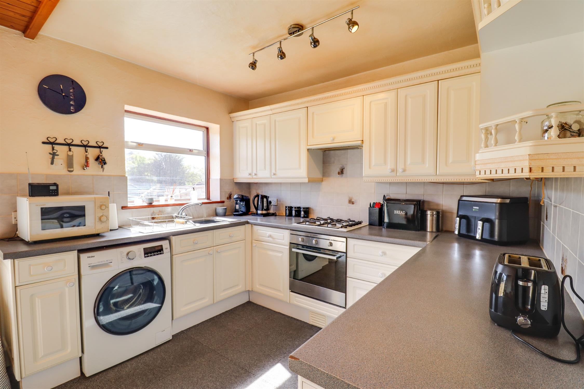 Smooth finish to ceiling, double glazed sliding doors and window to rear elevation, range of matching wall base and drawer units with roll top work surface over, stainless steel sink and drainer inset, integrated oven and hob with extractor fan over, space for appliances, tiled splashbacks, radiator.
