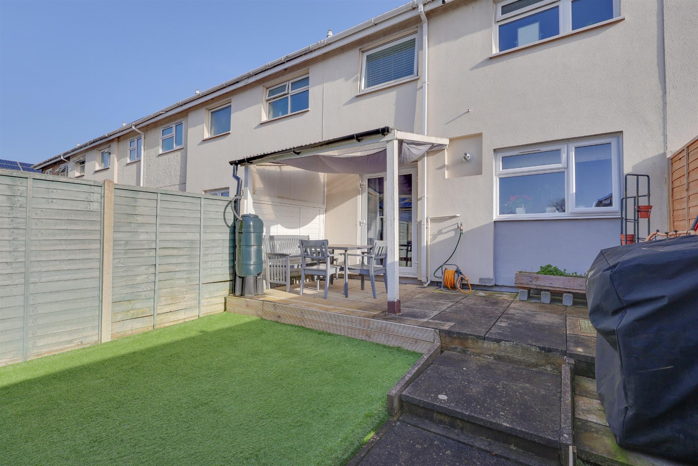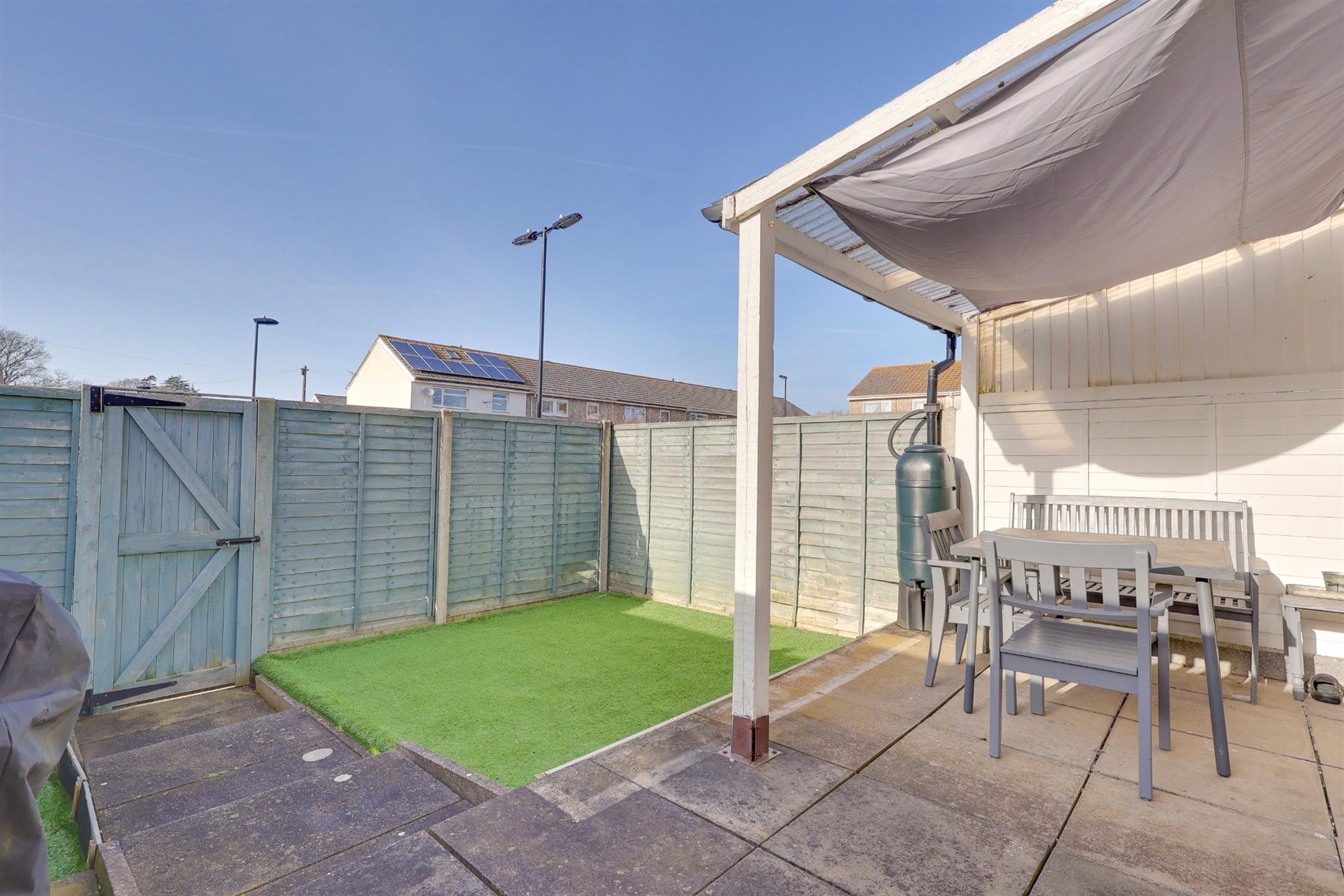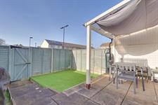Patio seating area with steps leading to an area of artificial lawn and rear gate leading to an alley way. Fitted pergola.