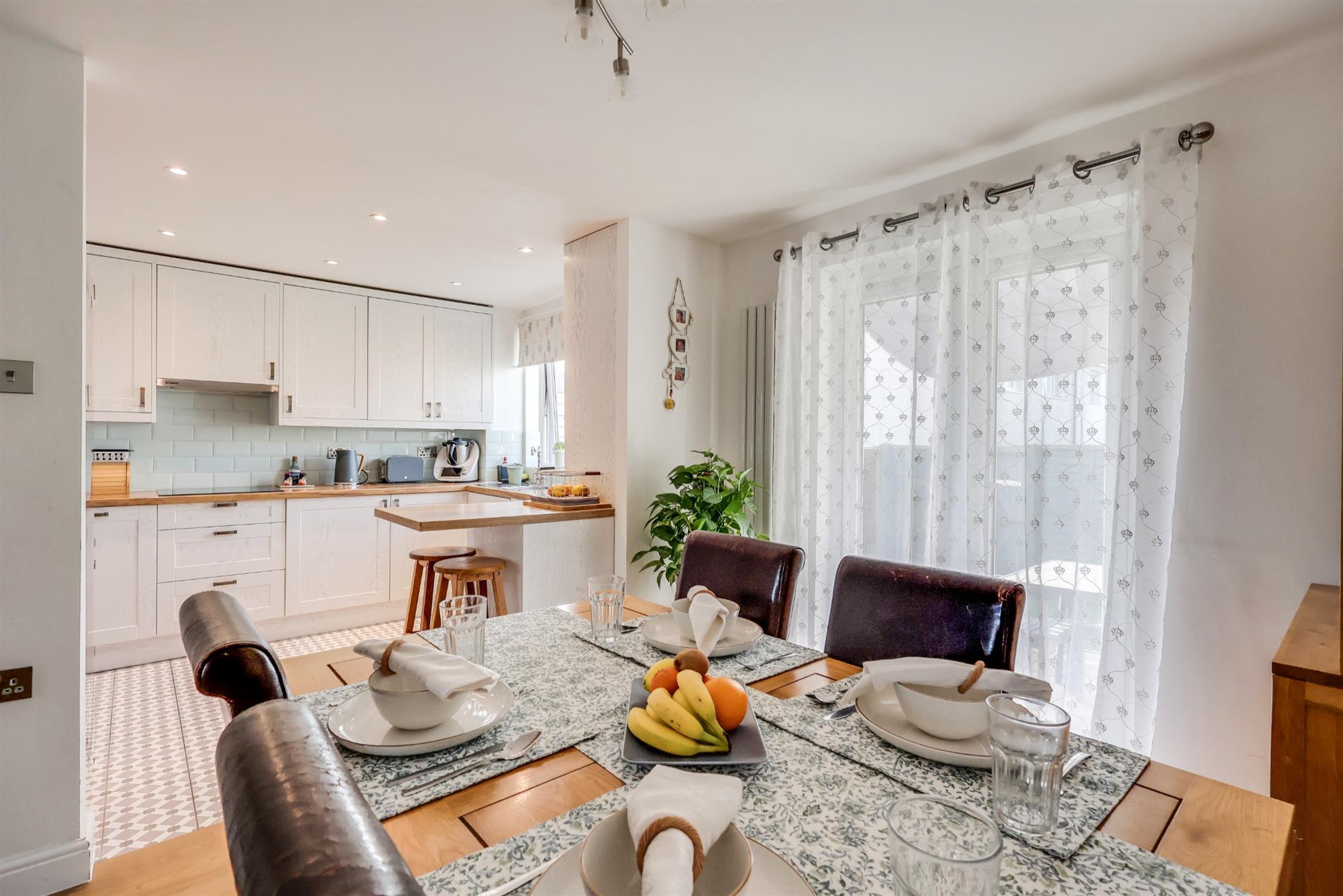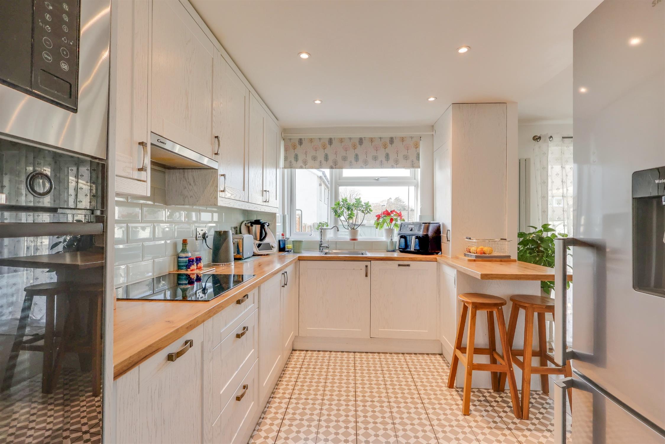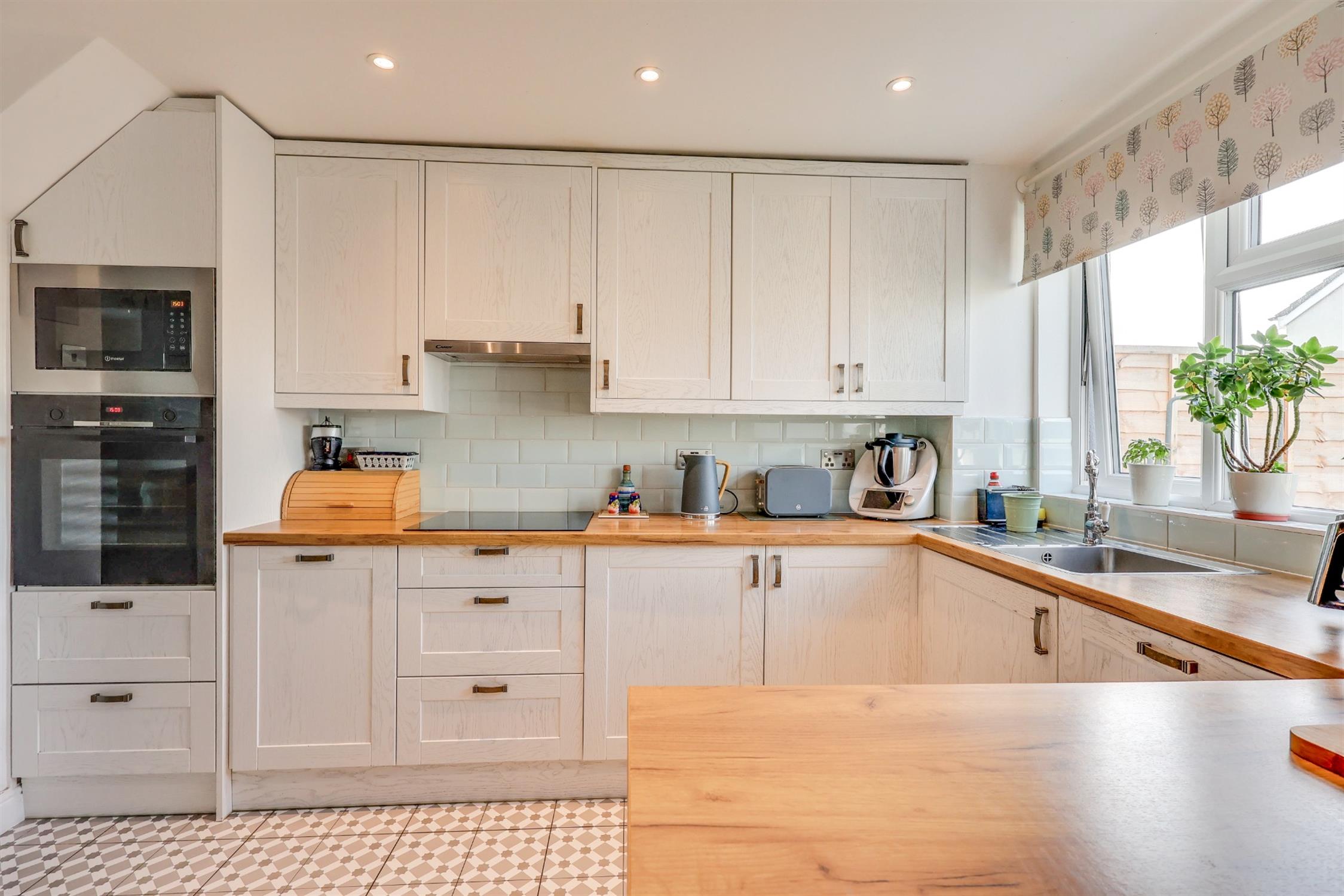 Smooth finish to ceiling, spotlights, double-glazed window to rear elevation, a range of matching wall, base and draw units with roll-top work surface over, breakfast bar, inset sink and drainer, built-in hob with extractor fan over, built-in cooker and microwave, integrated dishwasher and washer/dryer, tiled splash backs, space for fridge/freezer.