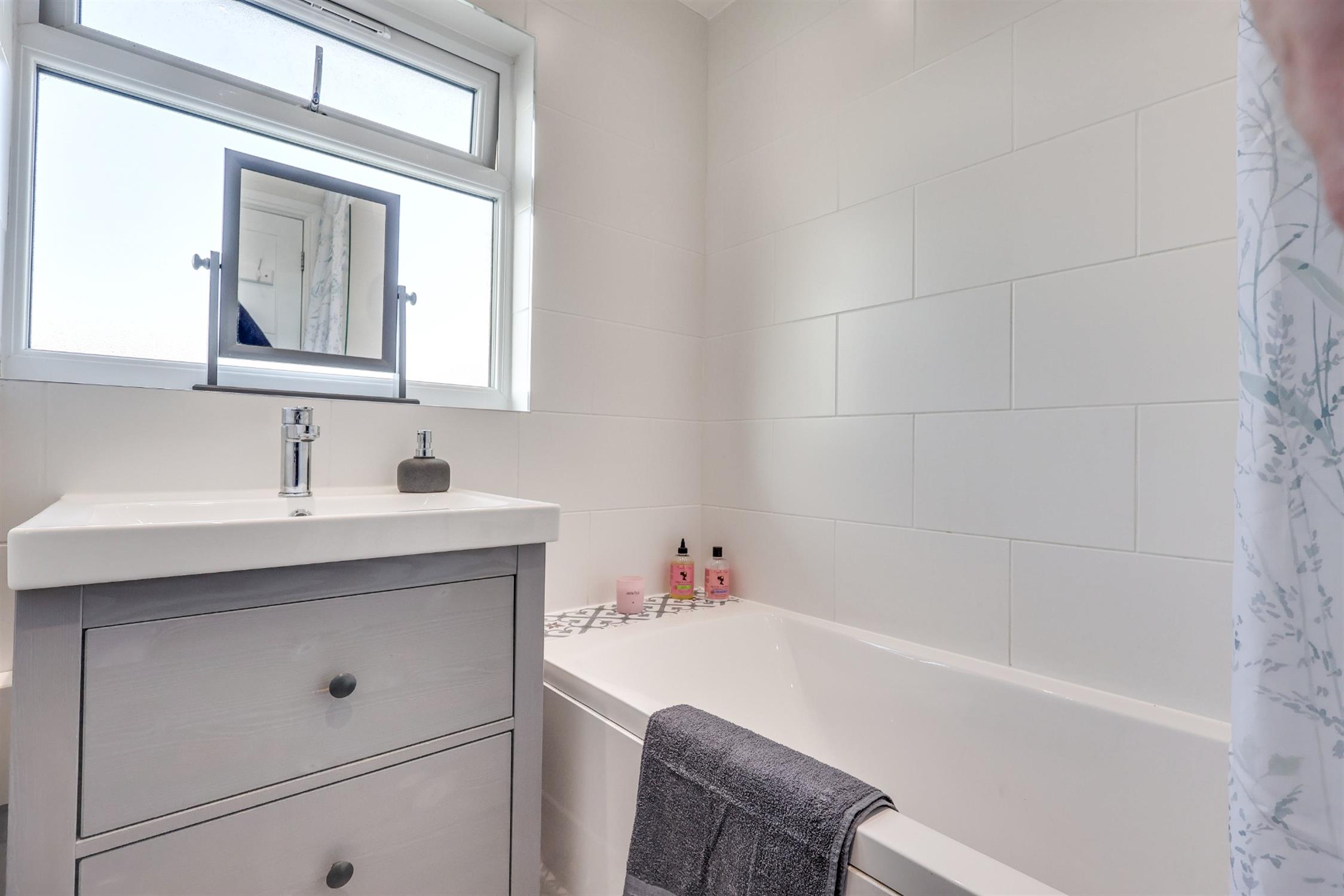 Smooth finish to ceiling, double glazed window to rear elevation, panel enclosed bath with shower over, vanity hand wash basin, heated towel radiator, tiled floor to ceiling.