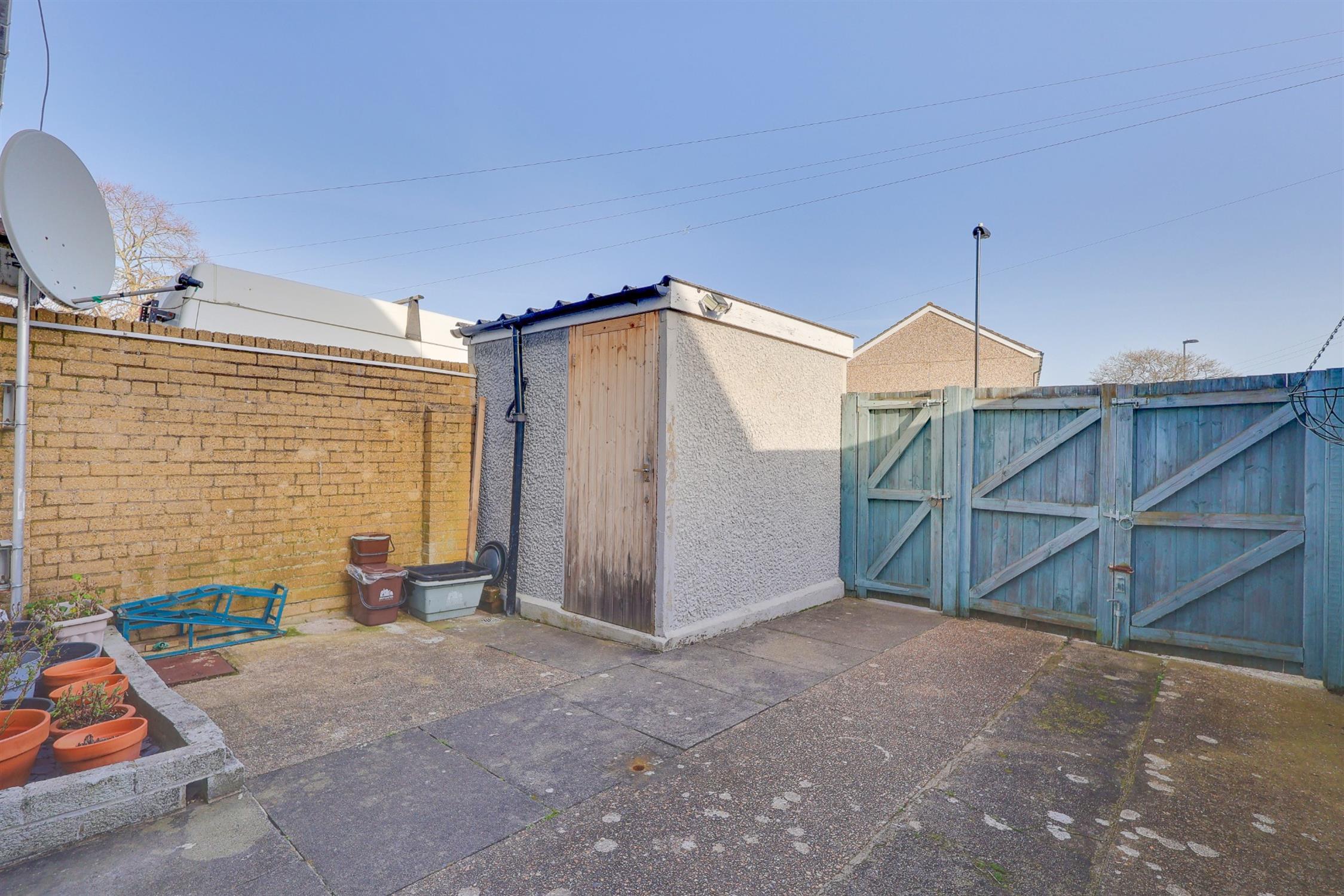 Dropped kerb leading to a hard standing driveway, double gates providing vehicle access, shed to front.