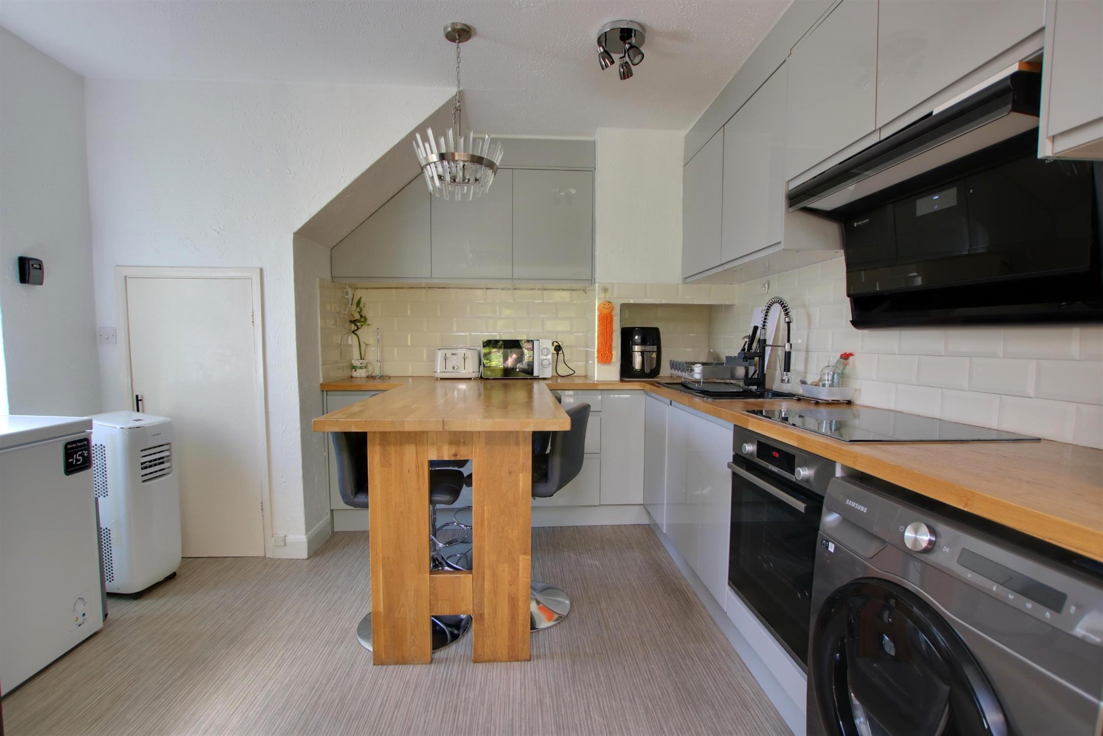 A comprehensive range of eye and base units finished in a contemporary style with handleless doors. Suitable space and plumbing for automatic washing machine. Built-in oven with hob and extractor hood over. Single drainer sink unit with mixer tap fitting. Metro style tiles to worktop surface. Wall mounted electric radiator. Fitted breakfast bar. Under stairs storage cupboard, double glazed window to side elevation.