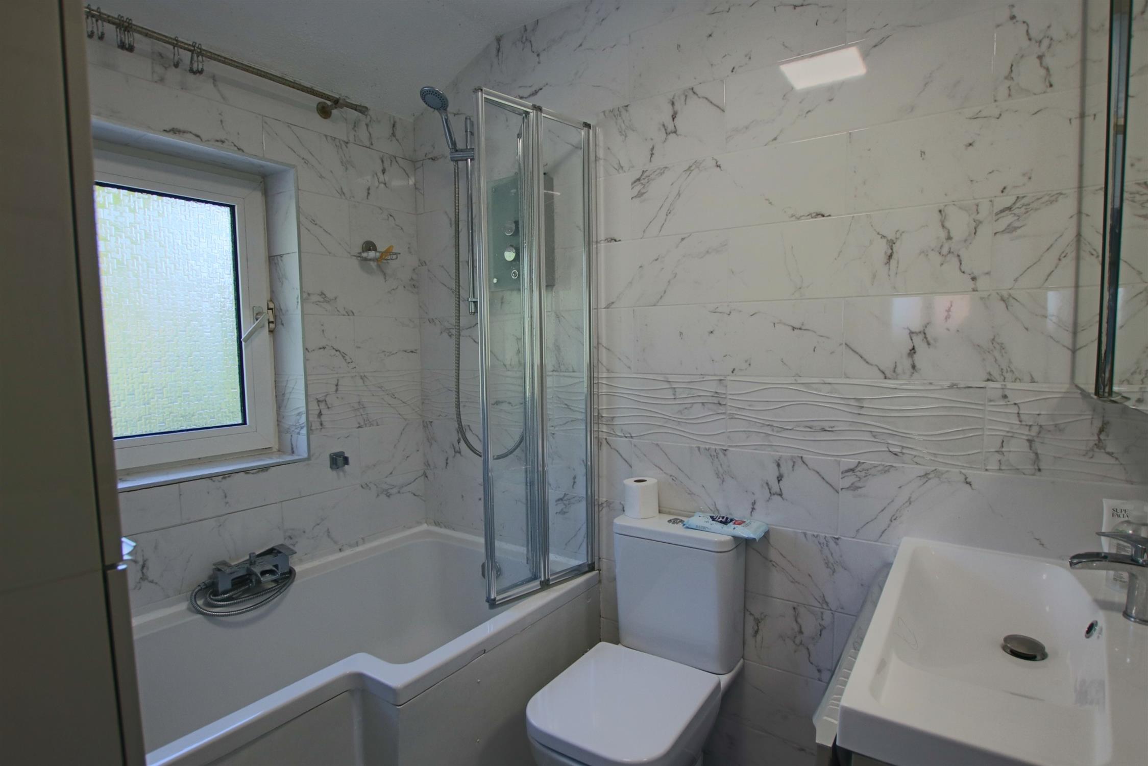 Three piece suite comprising: space saver panelled bath with shower over, low level WC and hand wash basin. Textured ceiling. Extractor fan. Heated towel rail.