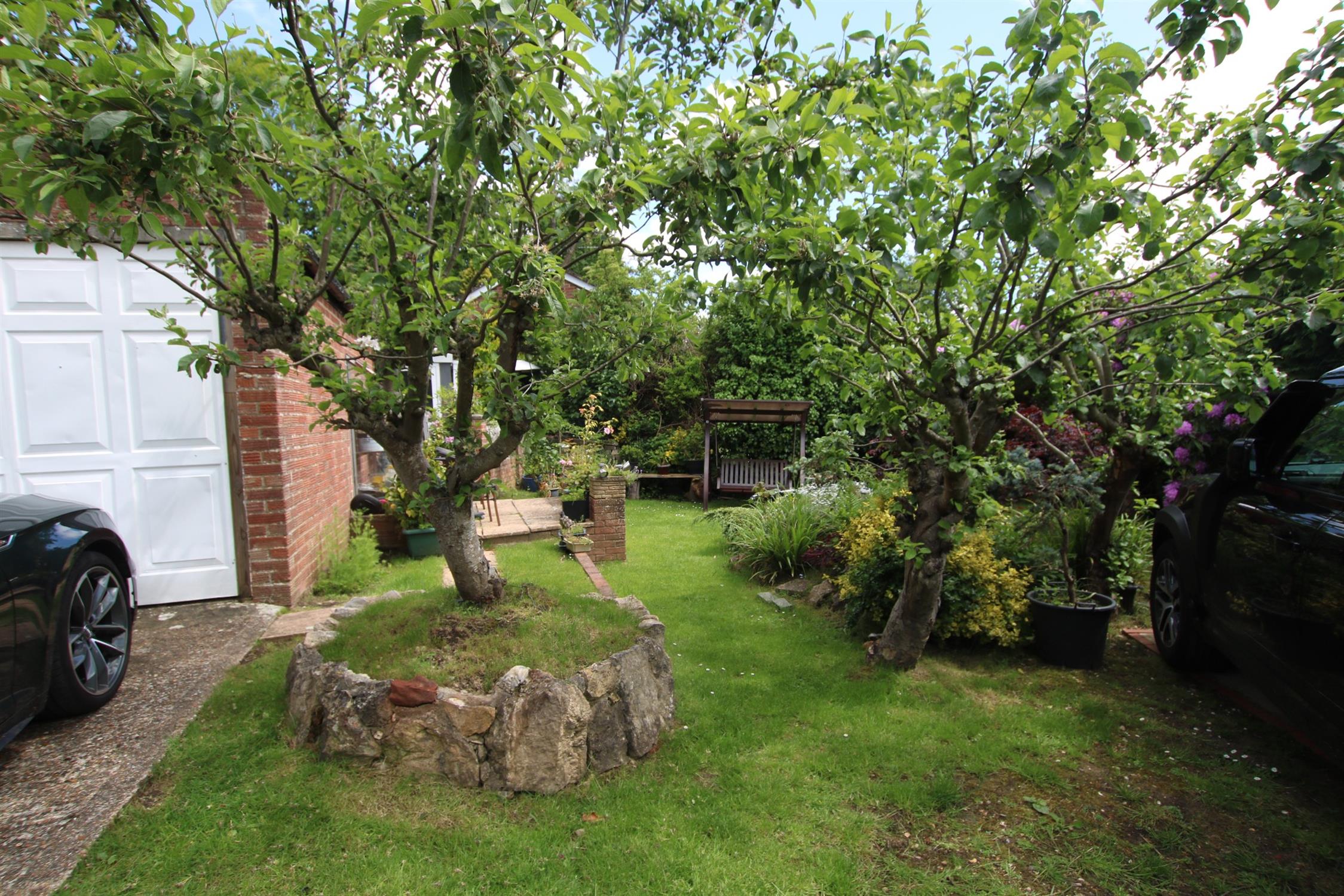 The front garden is a driveway providing off road parking for numerous vehicles and access to the detached garage.