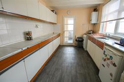 Range of base and eye level units, work surfaces with inset sink unit. Wall mounted central heating boiler, radiator, double glazed window with side elevation, door to: