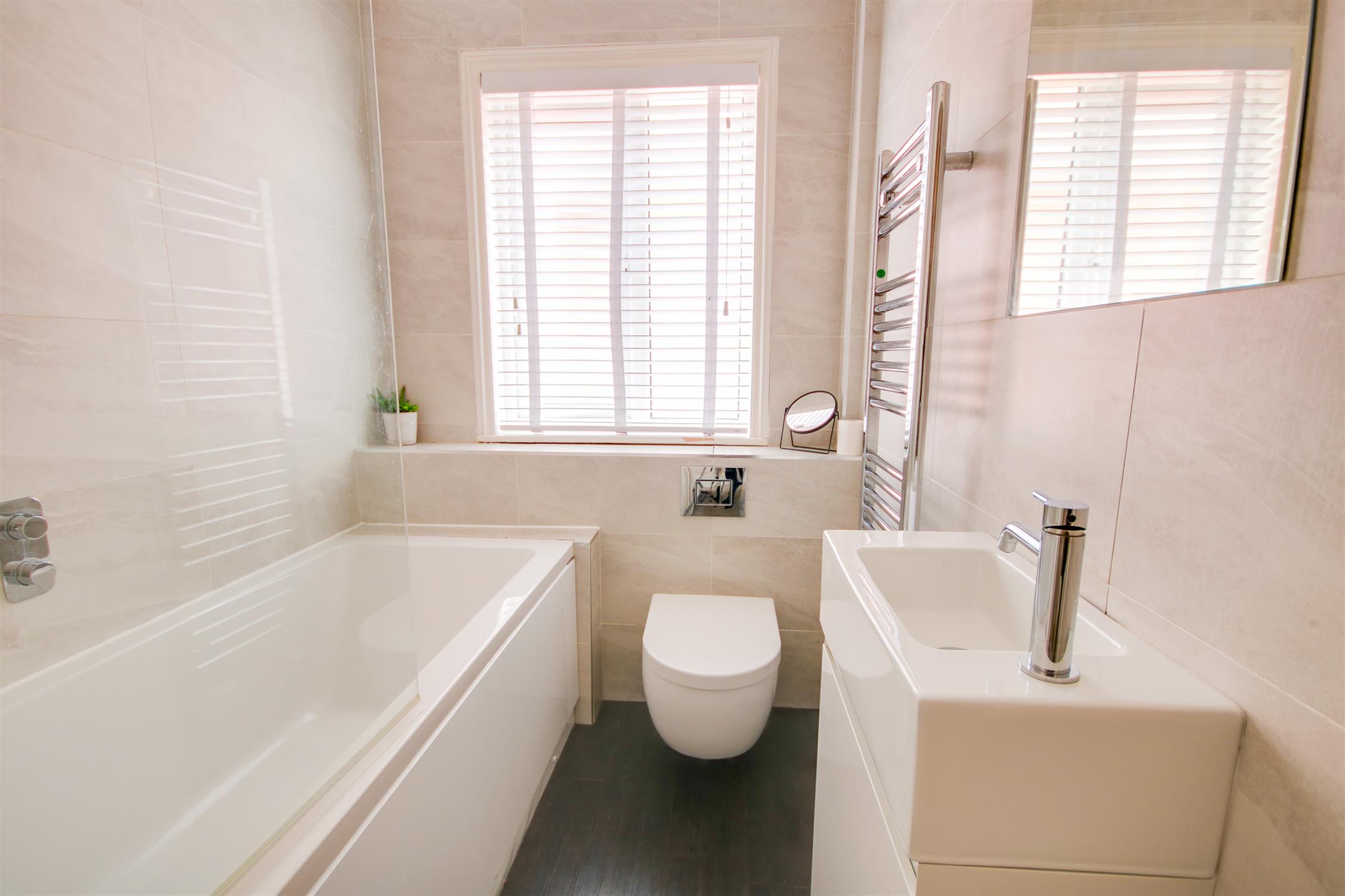 Smooth ceiling, UPVC double glazed obscured window to side. Modern three piece suite comprising WC, wash hand basin and panel bath with shower screen and electric shower. Fully tiled walls and floor. Heated ladder towel rail.