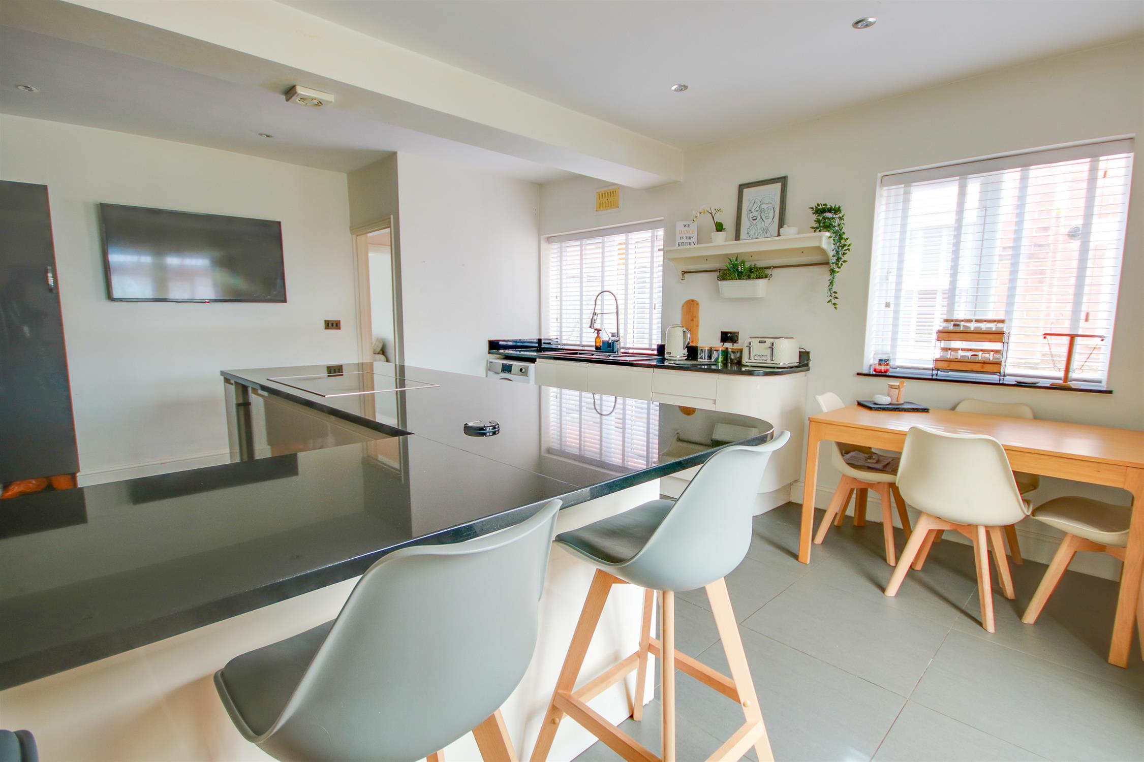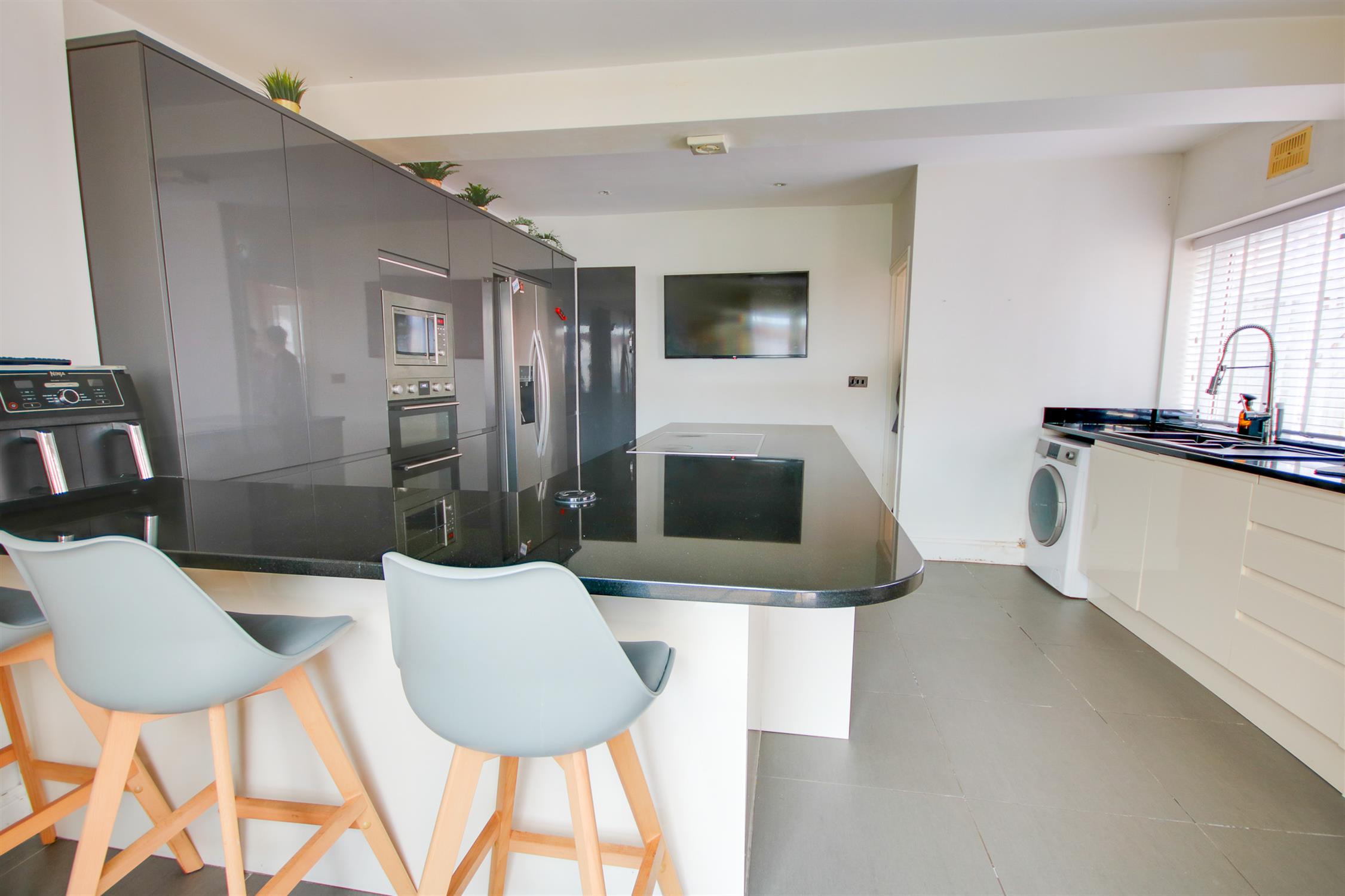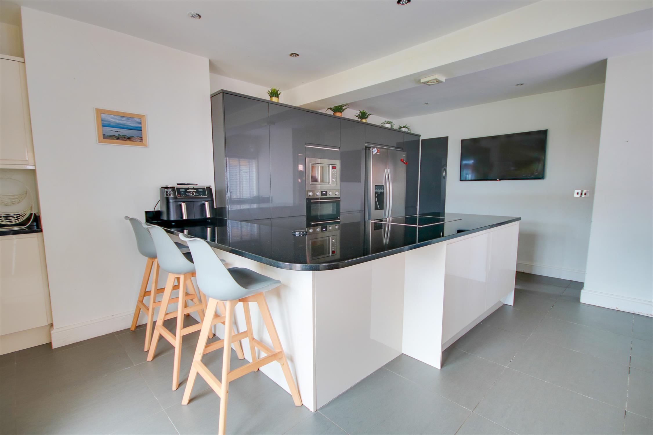 Smooth ceiling with inset spotlights, UPVC double glazed windows to side, UPVC double glazed french door to rear. Modern high gloss wall, base and drawer units with granite work surface over, composite bowl and a half sink with drainer. Integrated dishwasher, wine cooler. Built in oven, microwave and hob. Space for American style fridge/freezer and washing machine. Breakfast bar. Tiled flooring with under-flooring heating.