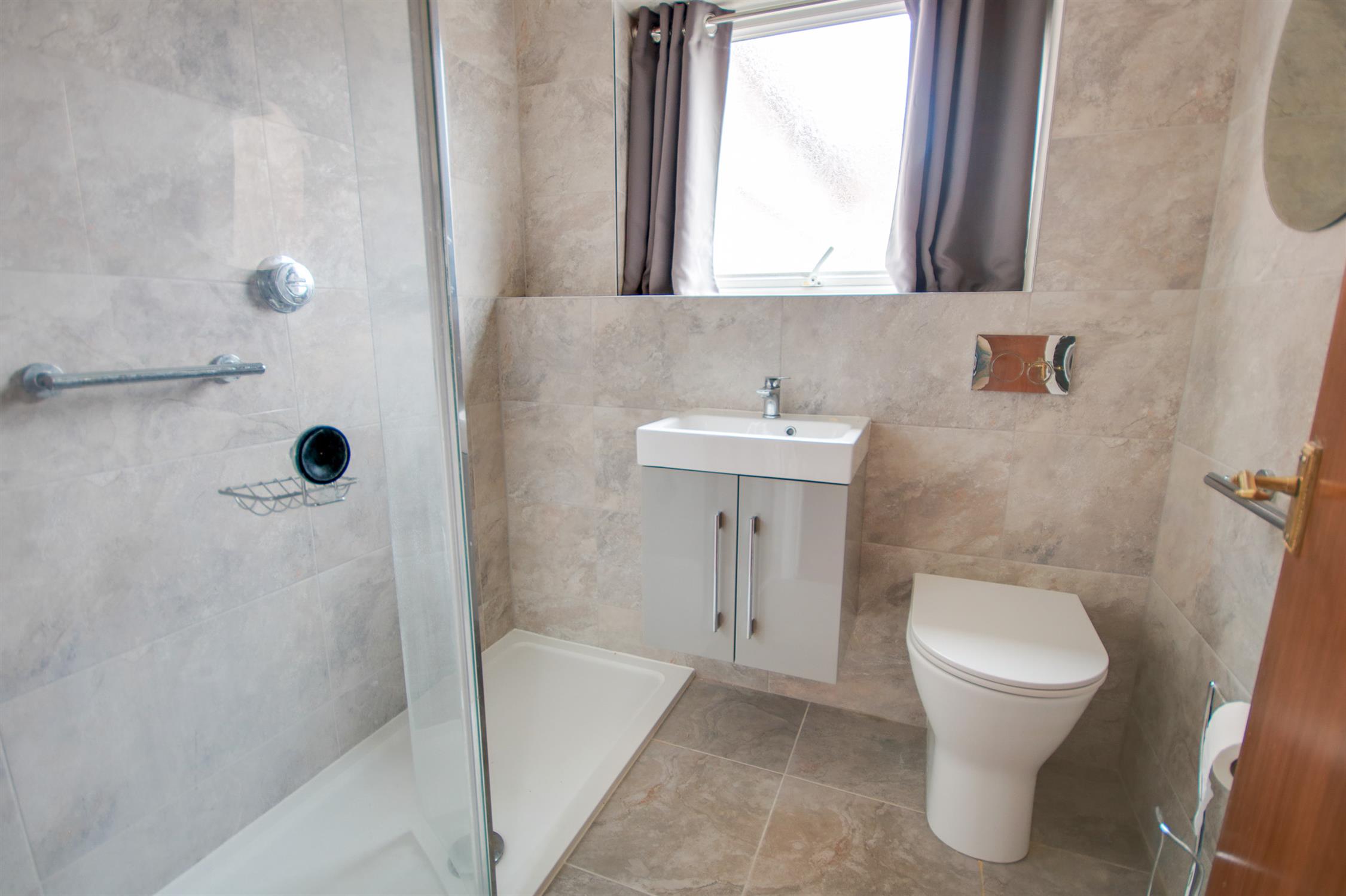 Smooth ceiling with spotlights inset, UPVC double glazed obscured window to side, modern three-piece suite comprising: WC, wash hand basin and walk-in shower cubicle with mains fed shower over, fully tiled walls and floor, heated ladder towel rail.