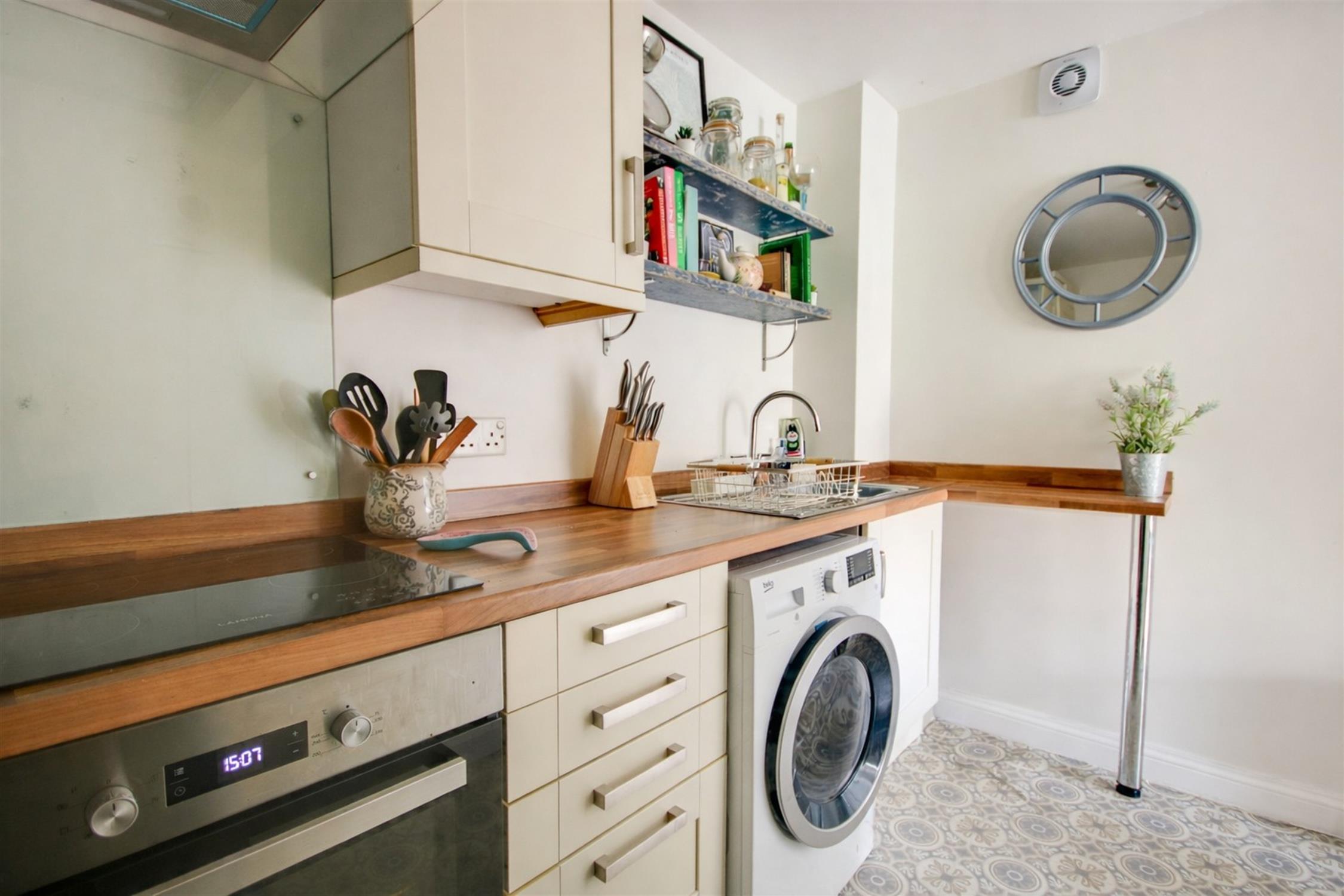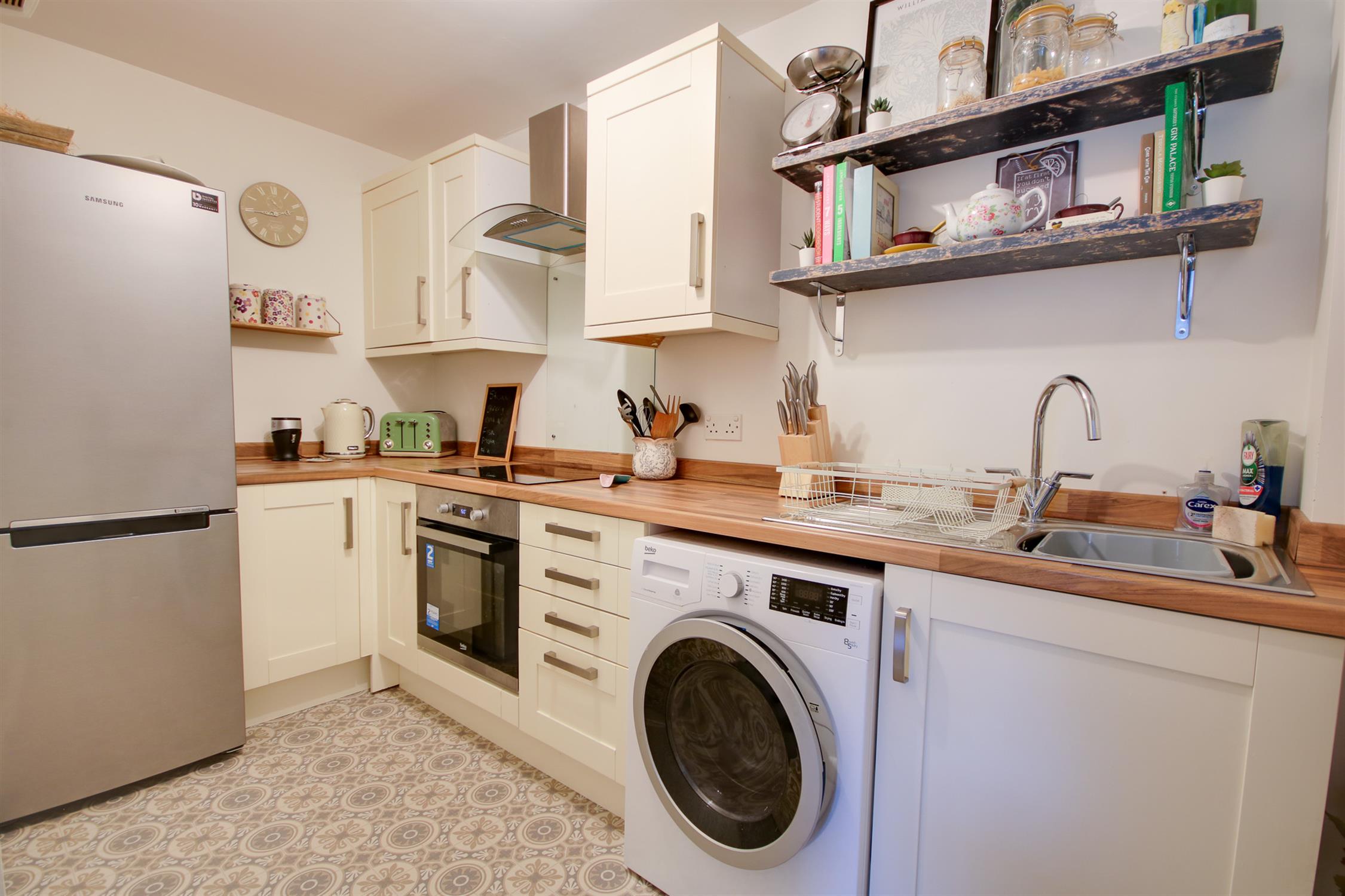Smooth ceiling with extractor, a range of wall, base and drawer units with work surface over, sink and drainer inset, integrated electric hob and oven with extractor over, under stair storage cupboard, space for appliances.