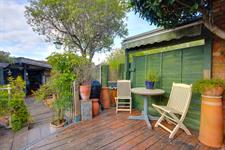 Fence enclosed rear garden, decking with path leading to workshop, pergola to side with a variety of mature shrubs and flowers.