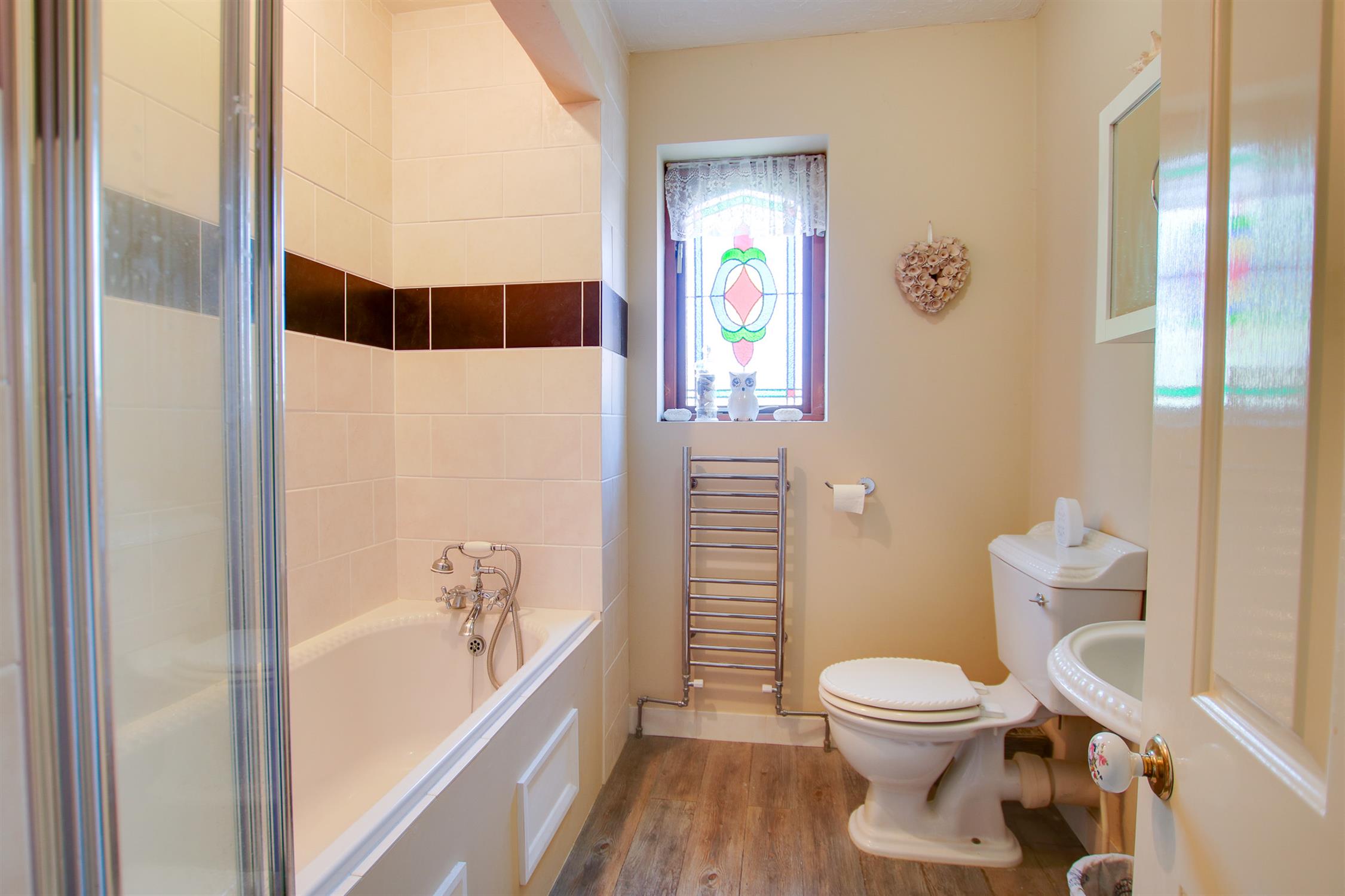 Bath tub with handheld shower and electric over head shower, chrome handrail, W/C, basin, wood window stained glass.
