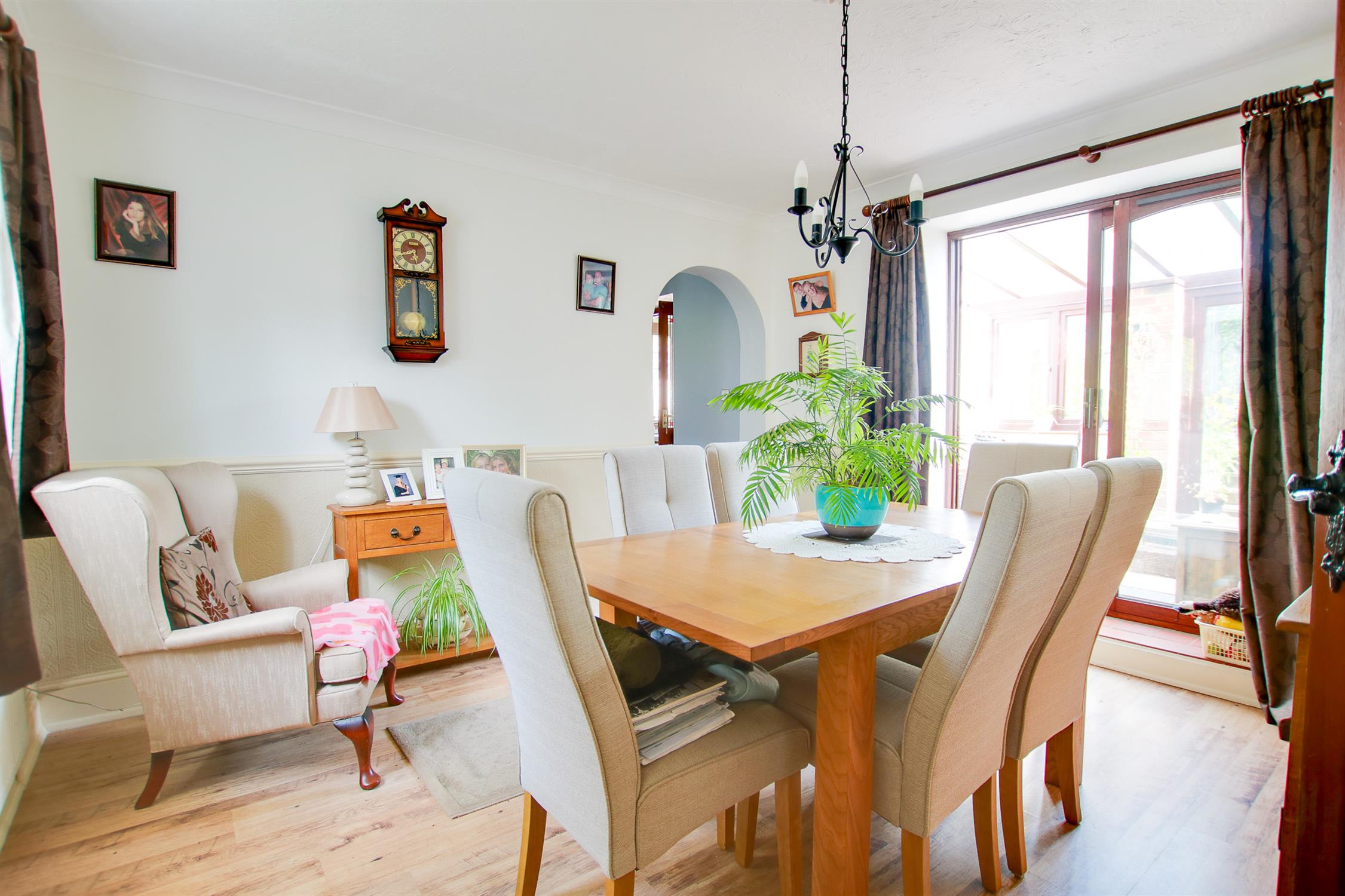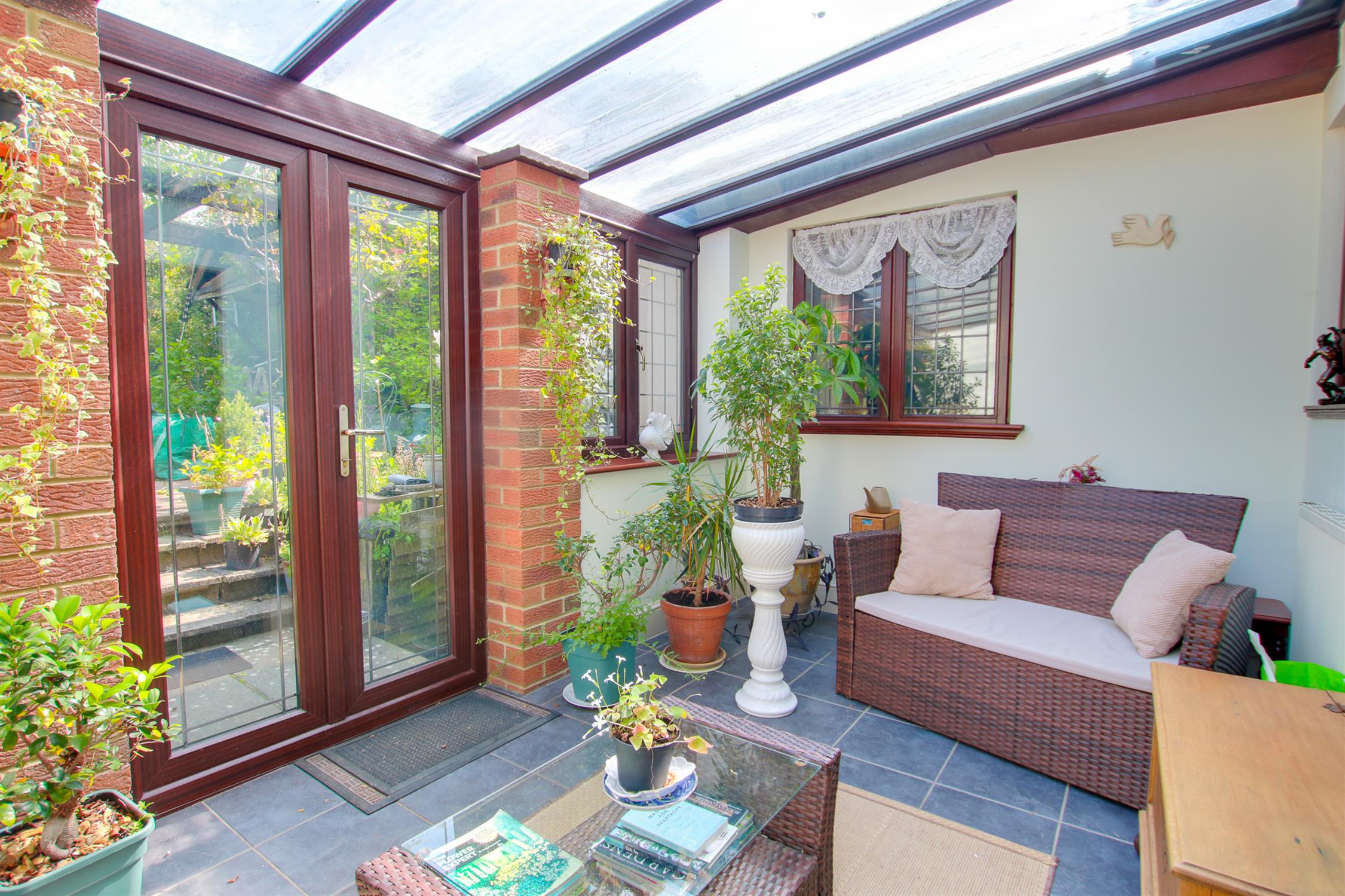 Two radiators, UPVC windows and patio doors to rear, glass roof, tile floor.