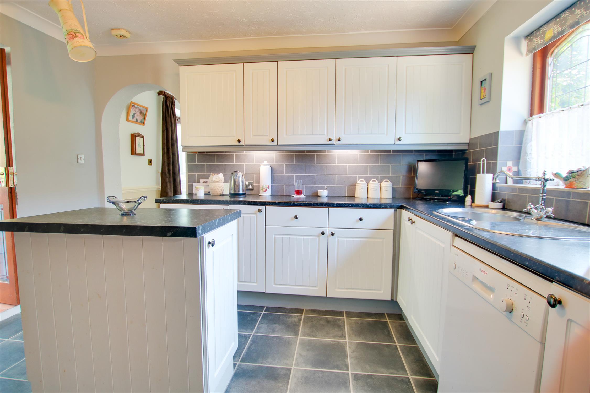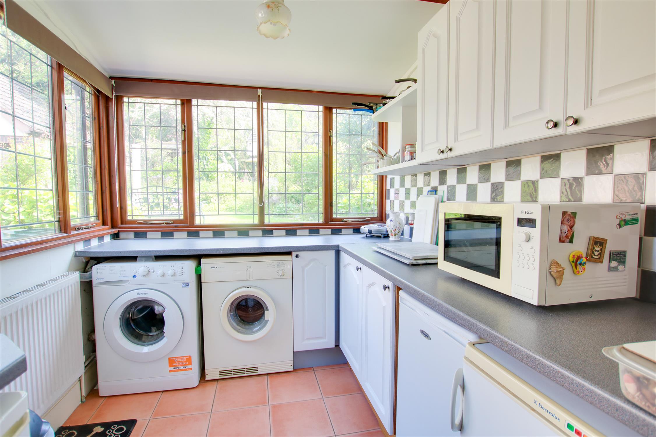 Double aspect wood frame double glazed windows, wall and base units, wall and floor tile, space for washing machine and tumble dryer and fridge/freezer, one radiator.