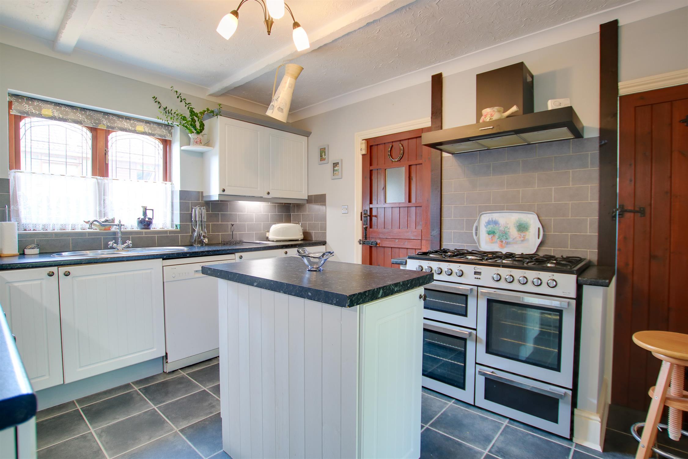 Wall and base units, circular stainless steel sink and drainer, Flavel four ring stove, dishwasher space, fixed island, wall tiling, wood frame double glazed unit to front, access to utility, larder, integral fridge.