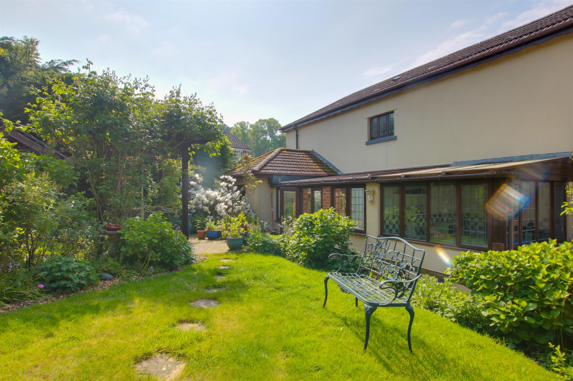 Landscaped rear, side access, variety of shrubs, flowers, fencing.