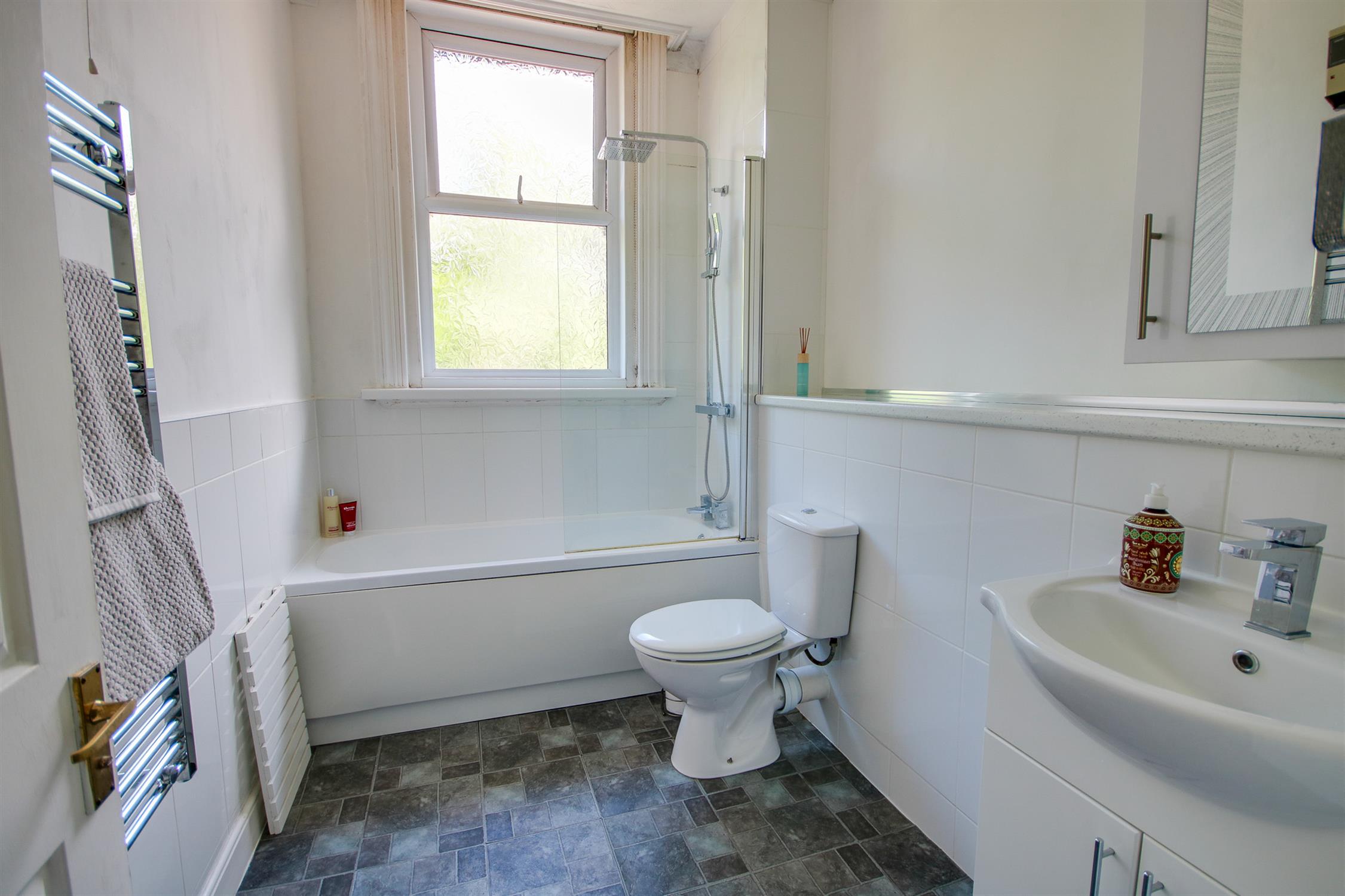 Textured finish to coved ceiling, double glazed obscured window to front aspect, panel enclosed bath with rainfall style shower over and mixer taps, vanity hand wash basin, low level WC, fitted storage cupboard which is mirror fronted, recessed shelving, tiling to principal areas, heated ladder towel rail.
