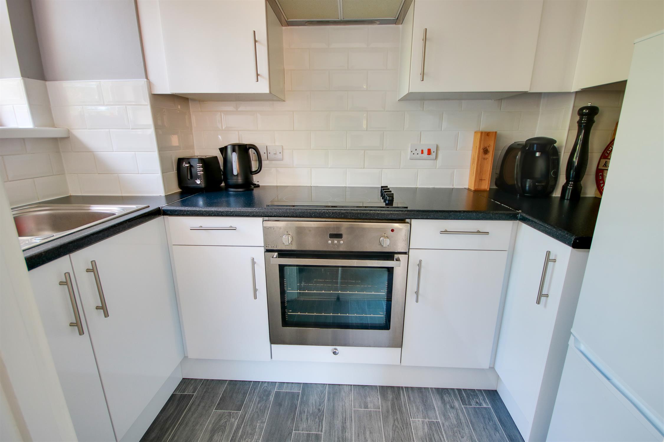 Textured finish to coved ceiling, double glazed window to front aspect, a range of modern wall and base drawer units with roll top work surface over, built in cooker and hob with extractor over, stainless steel sink and drainer inset, space for fridge freezer, tiled splash-backs.