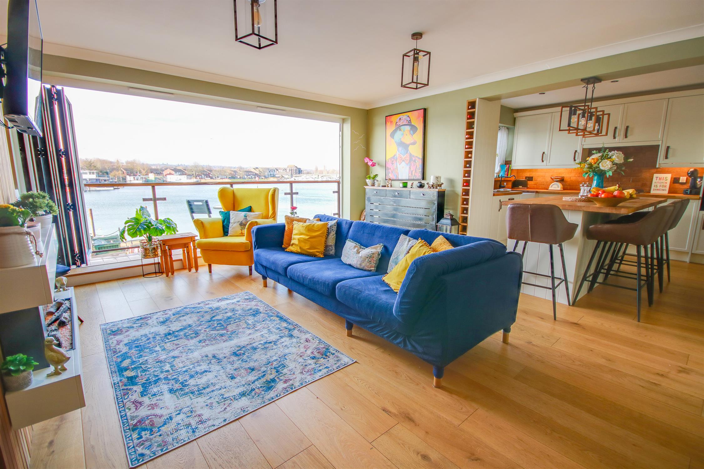 Smooth and coved ceiling, double glazed window to rear, double glazed bi-folding doors to rear enjoying breath-taking views over the river Itchen, wall base and drawer units with work surface over, butler-style sink inset, built in oven, five-ring gas hob, integrated fridge/freezer and dishwasher, breakfast island with seating space for three, acoustic panelled feature wall, radiator.