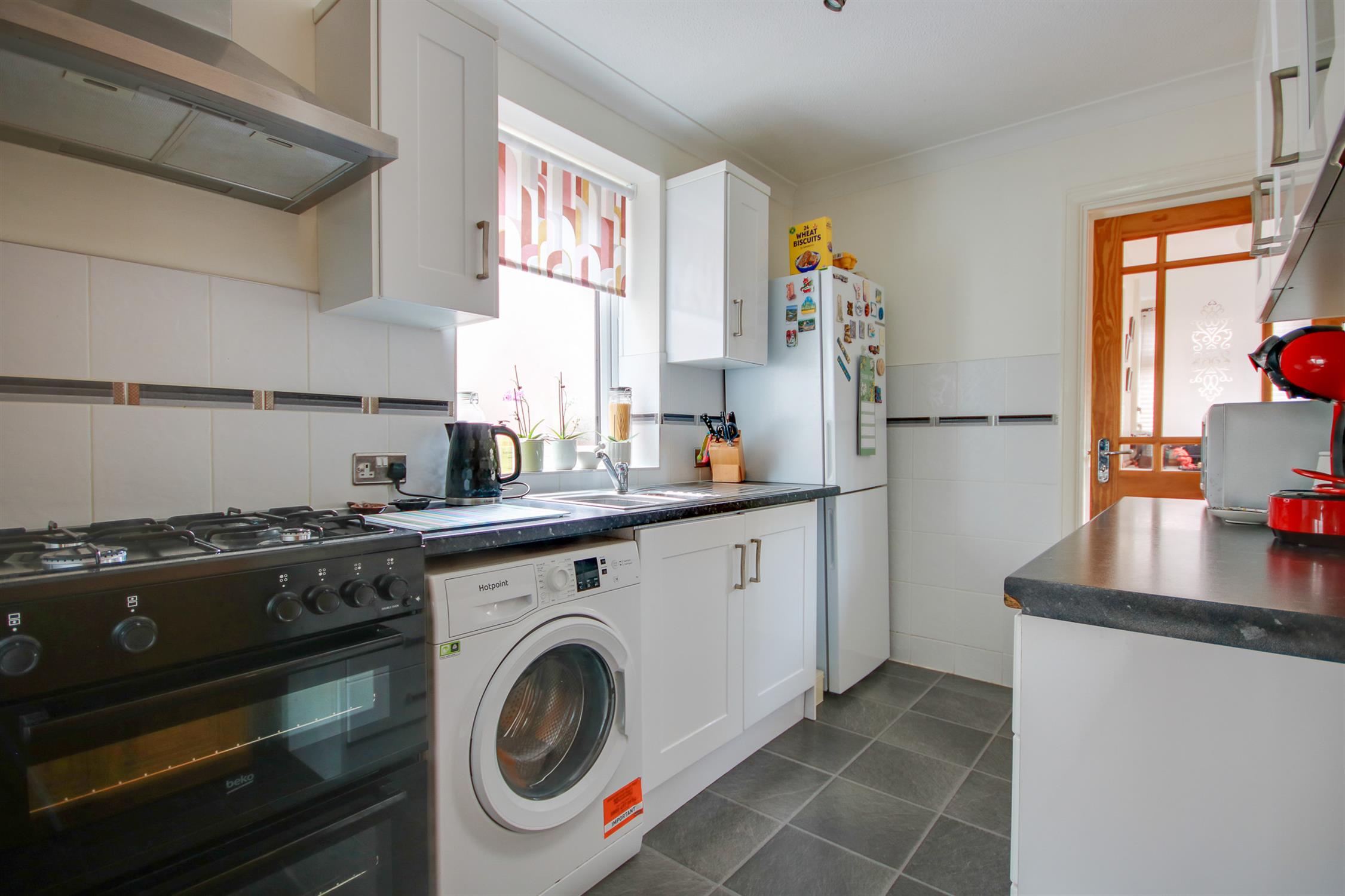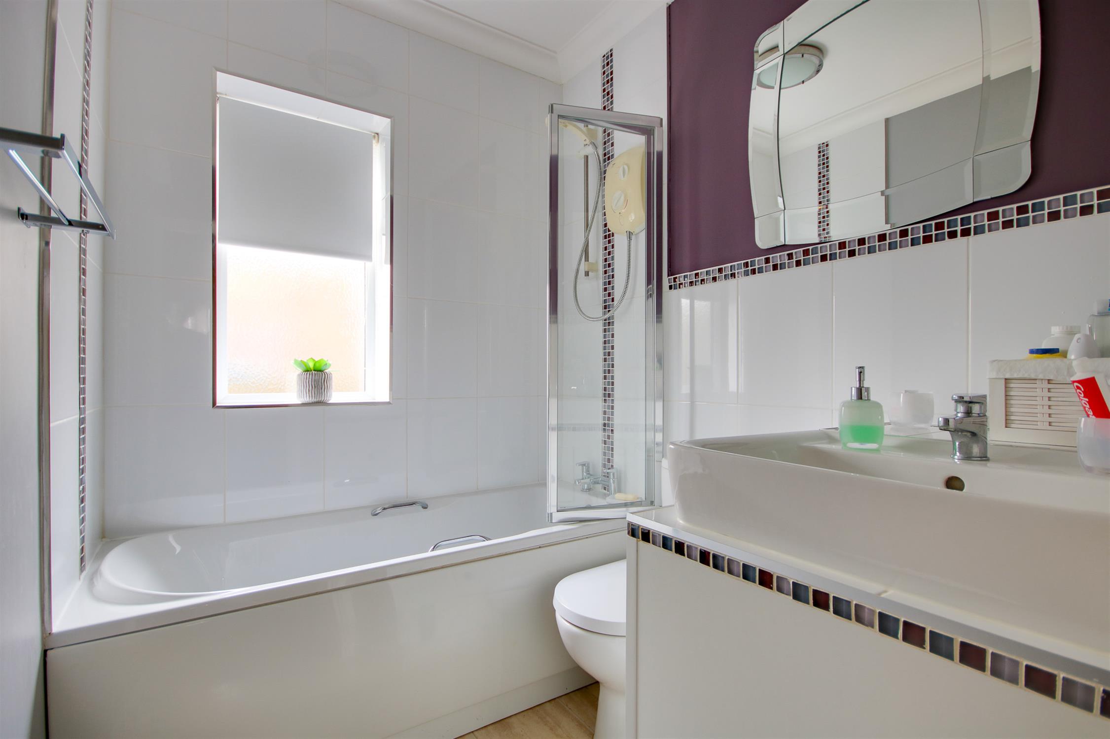 Textured and coved ceiling, double glazed obscured window to front, panel enclosed bath with electric shower over, WC, wash hand basin, tiling to principal areas.
