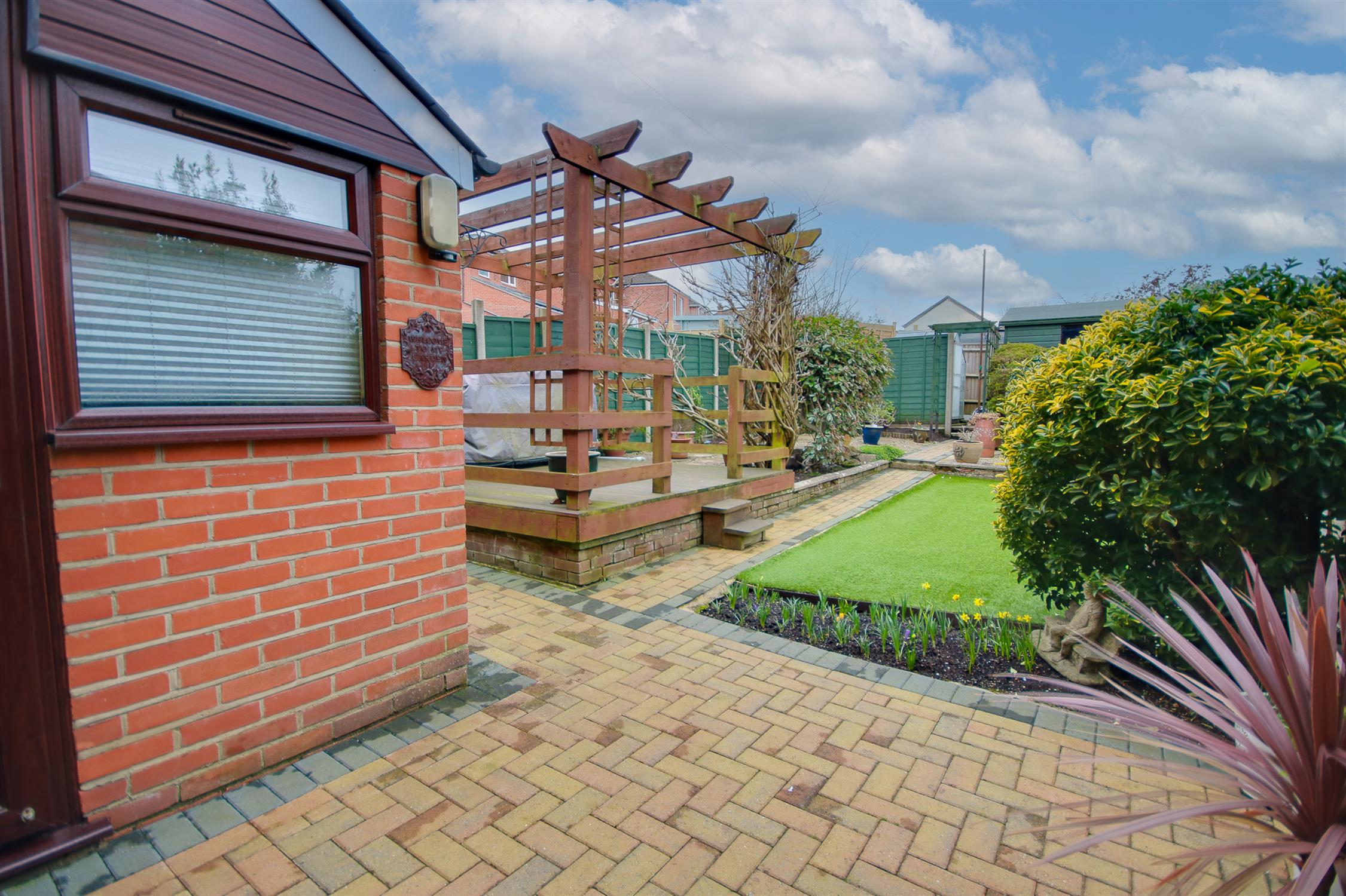 Fence enclosed rear garden, patio seating area, decked seating area, artificial lawn, shed.