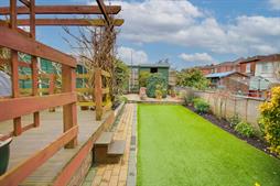 Fence enclosed rear garden, patio seating area, decked seating area, artificial lawn, shed.