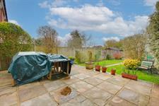 Fence enclosed rear garden, mainly laid to lawn, patio seating area, green house, radiator, original wood flooring.