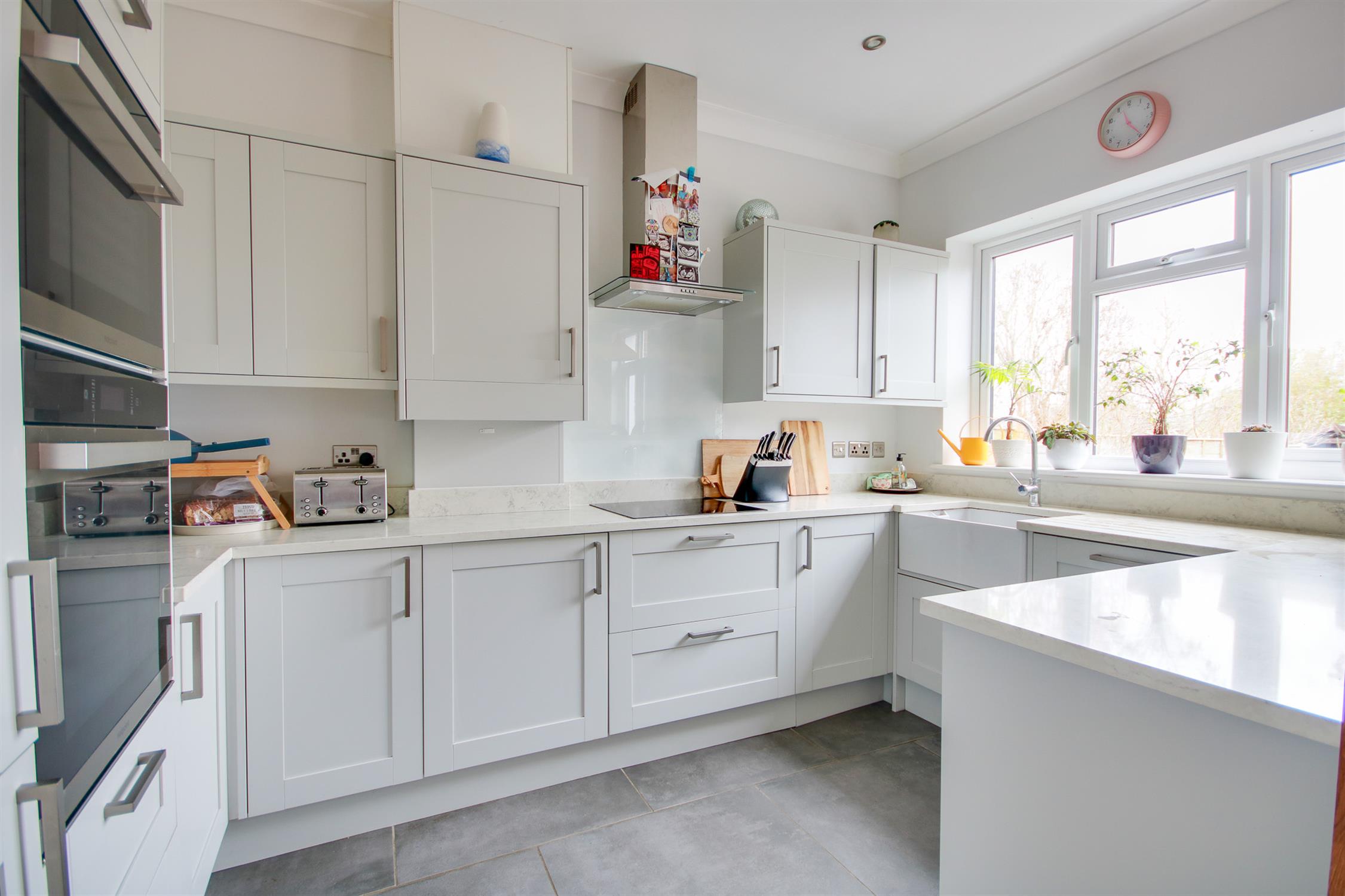 Smooth and coved ceiling, double glazed window to rear, double glazed French doors to front, a range of wall, base and drawer units with work surface over, butler sink, built-in fridge/freezer, dishwasher and washing machine, built-in oven and hob with extractor over, original wood flooring.