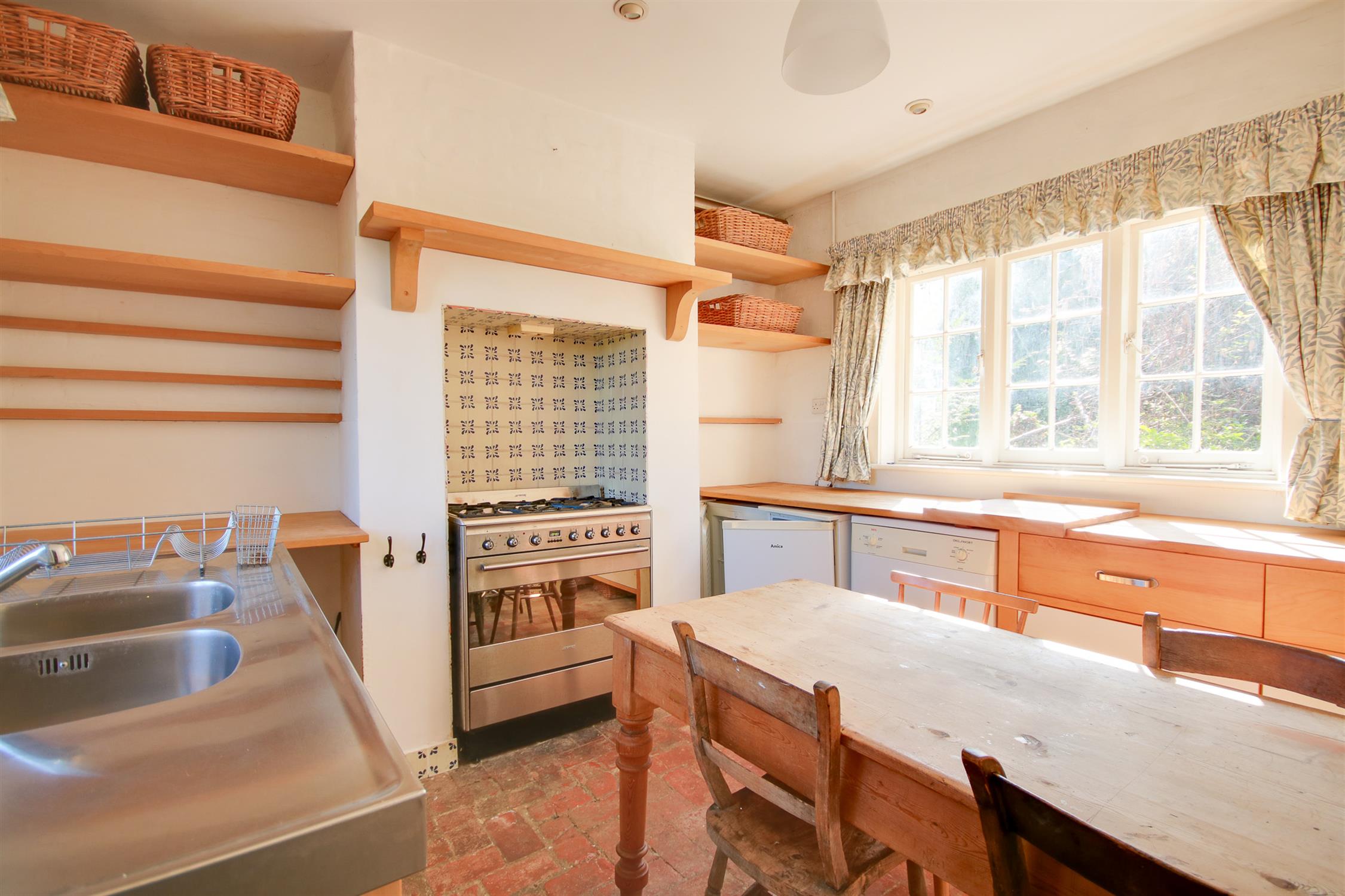 Smooth ceiling with inset spotlights, dual aspect windows to front and rear, base and drawer units with work surface over, freestanding double basin and sink unit, space for range cooker and appliances, original floor, radiator.