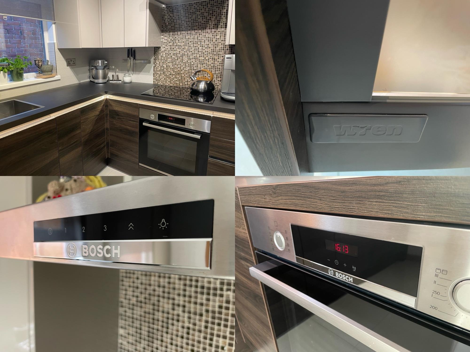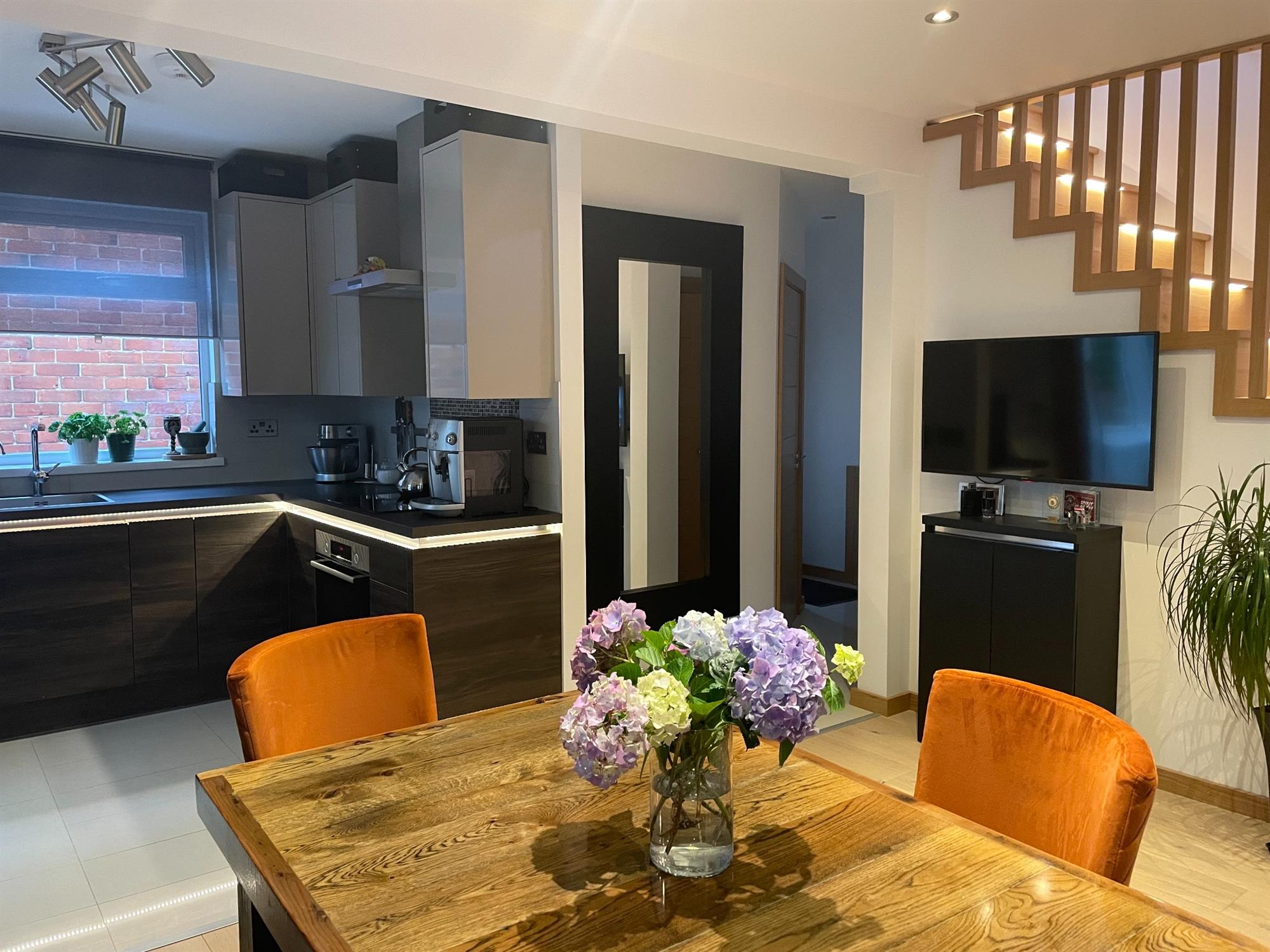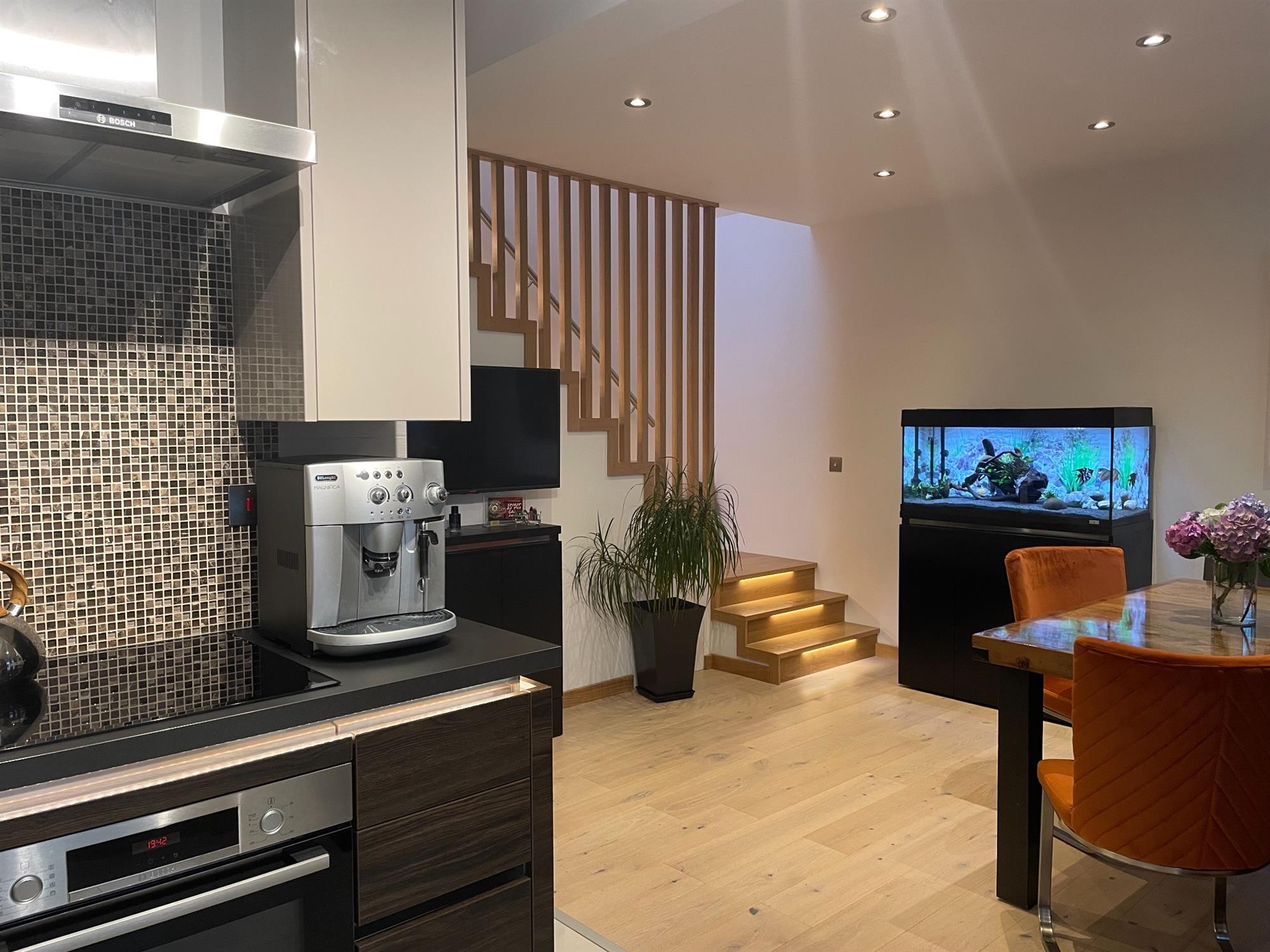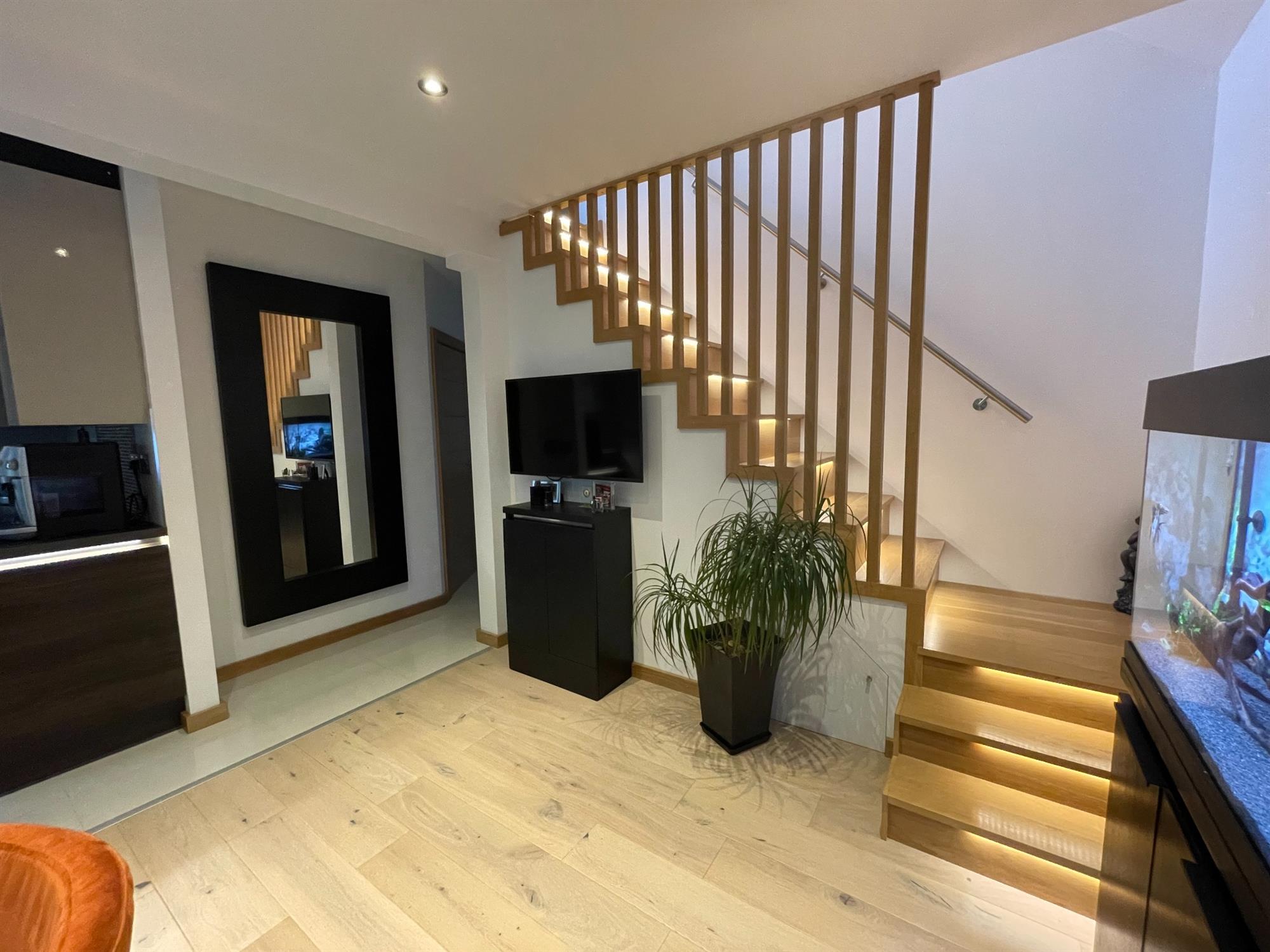 Smooth ceiling with inset spotlights, UPVC double glazed window to rear and side. WREN fitted kitchen, handle-less slab fronted wall, base and drawer units with "floating" working surface over, stainless steel sink inset with instant hot tap. Tiled splash backs. Integrated BOSCH appliances, built-in oven with induction hob over. LED lighting. Oak staircase rising to first floor with individual step LED lights, further storage under. Glazed oak door leading to: