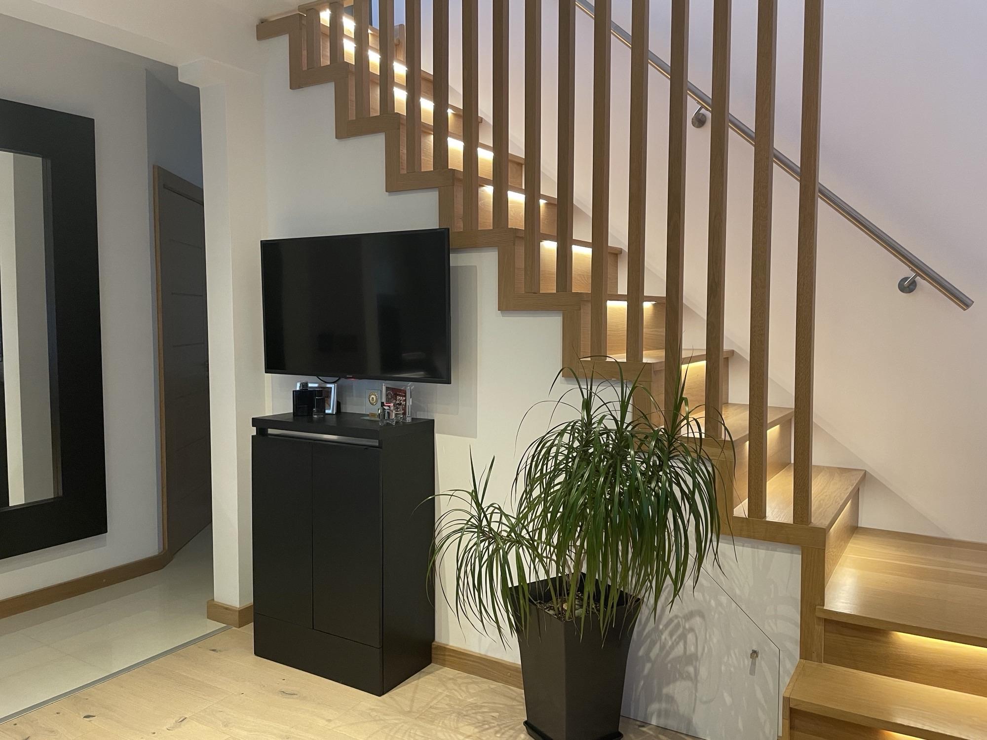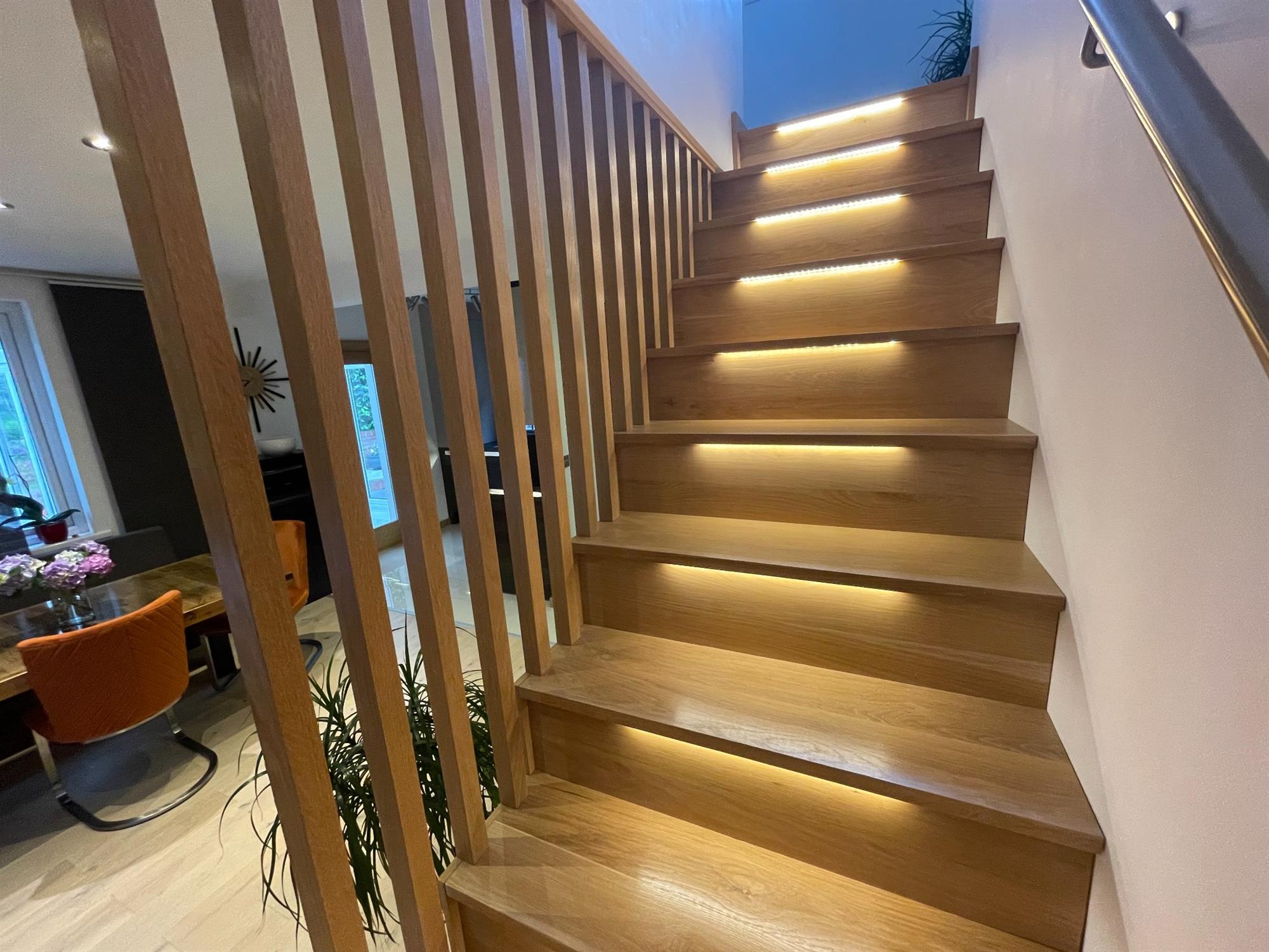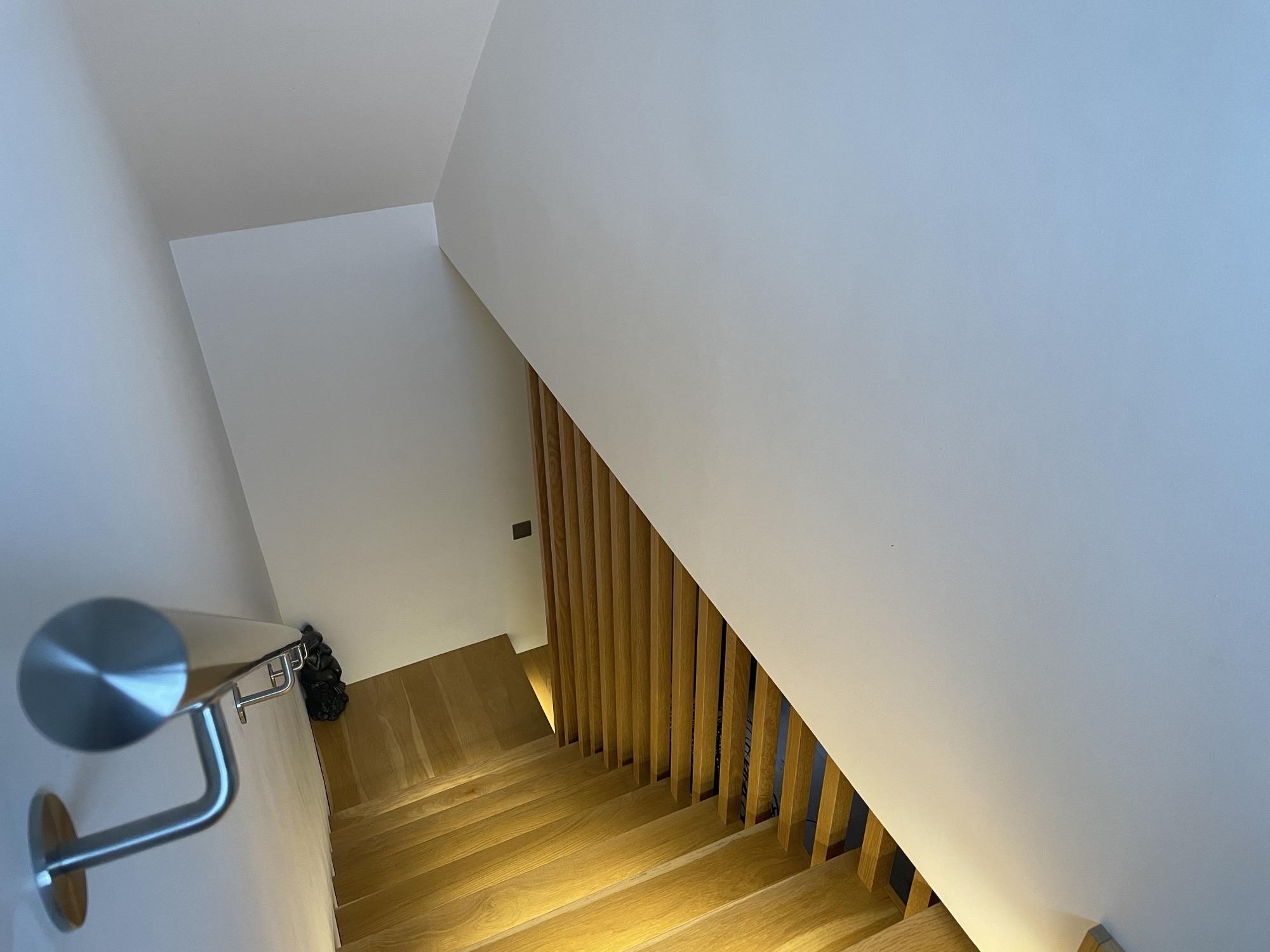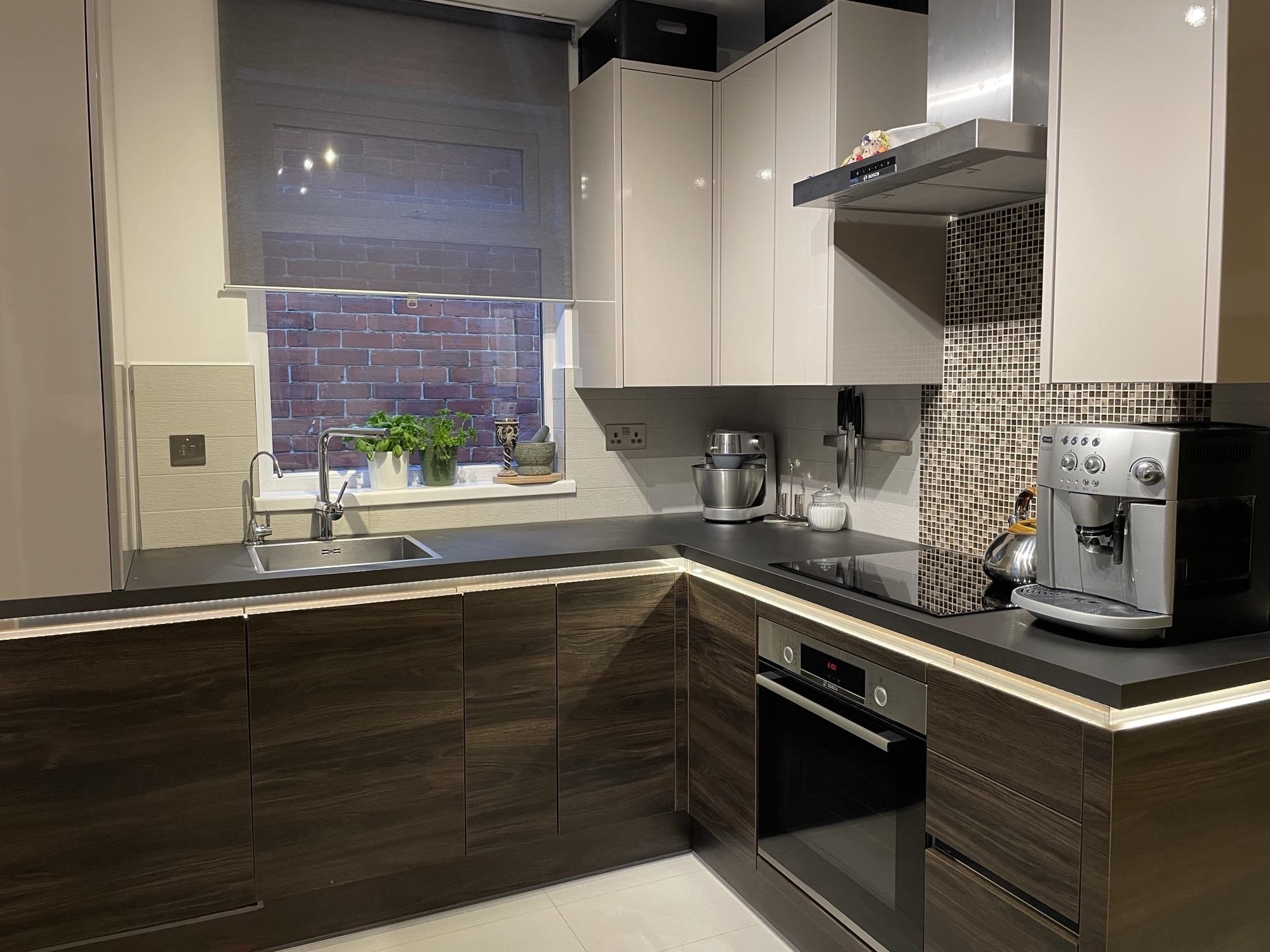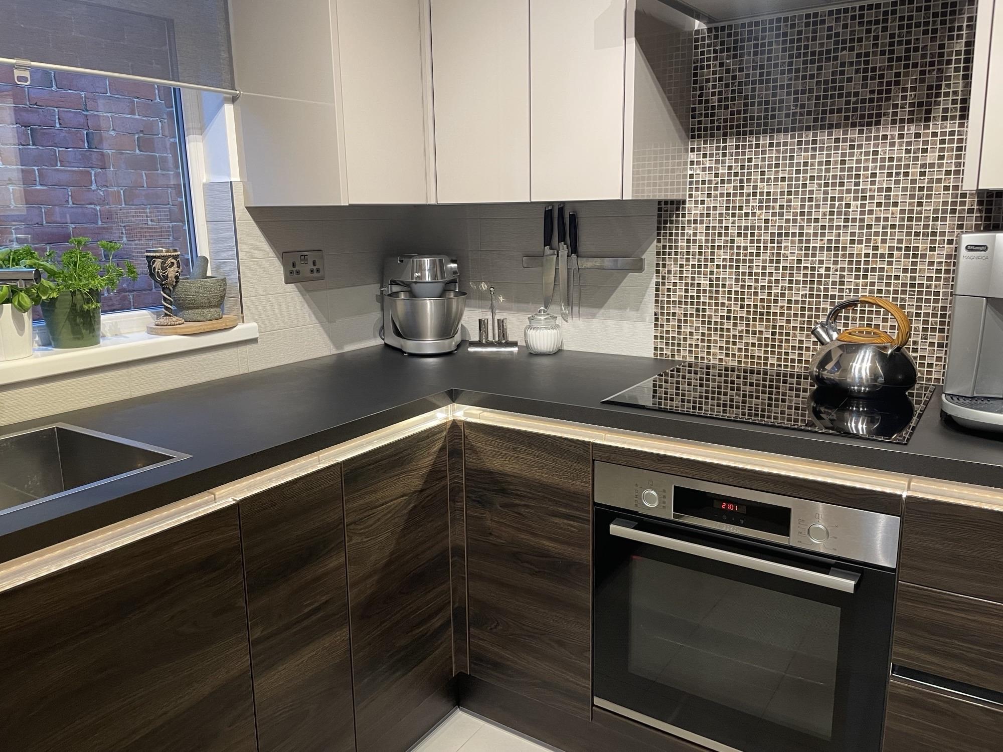 Smooth ceiling with inset spotlights, UPVC double glazed window to rear and side. WREN fitted kitchen, handle-less slab fronted wall, base and drawer units with "floating" working surface over, stainless steel sink inset with instant hot tap. Tiled splash backs. Integrated BOSCH appliances, built-in oven with induction hob over. LED lighting. Oak staircase rising to first floor with individual step LED lights, further storage under. Glazed oak door leading to: