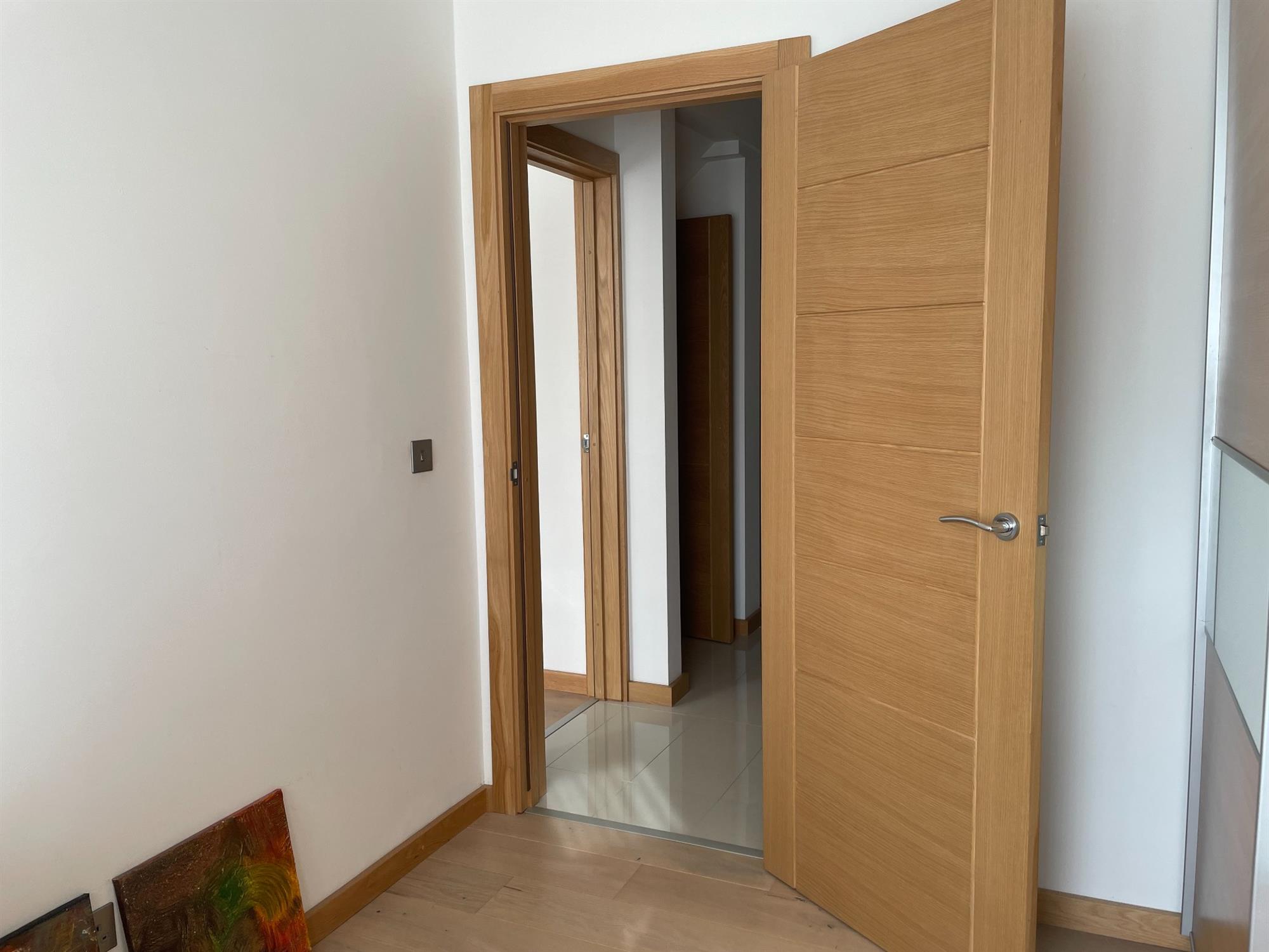 Smooth ceiling, UPVC double glazed window to the side elevation. Oak doors leading to: