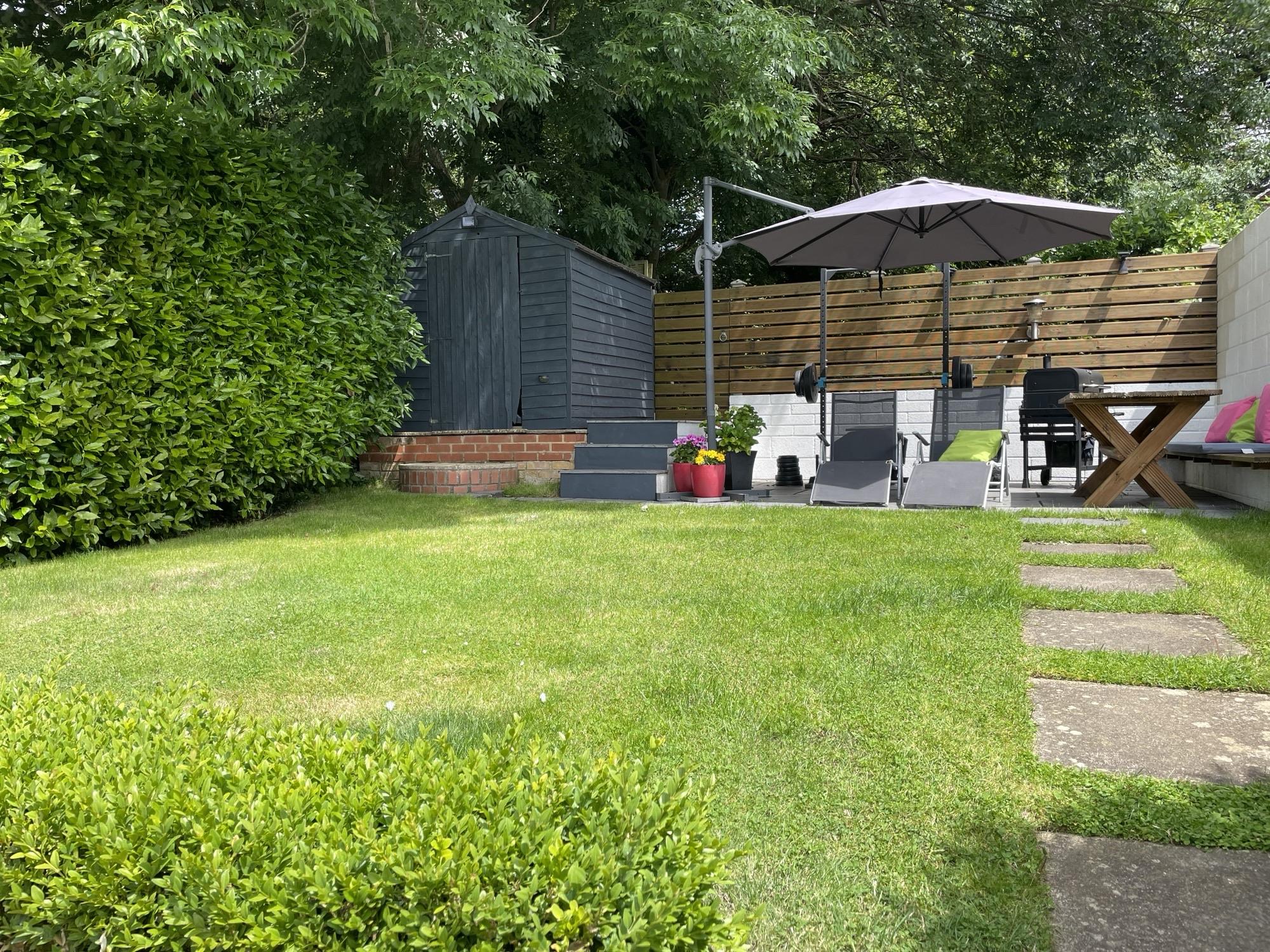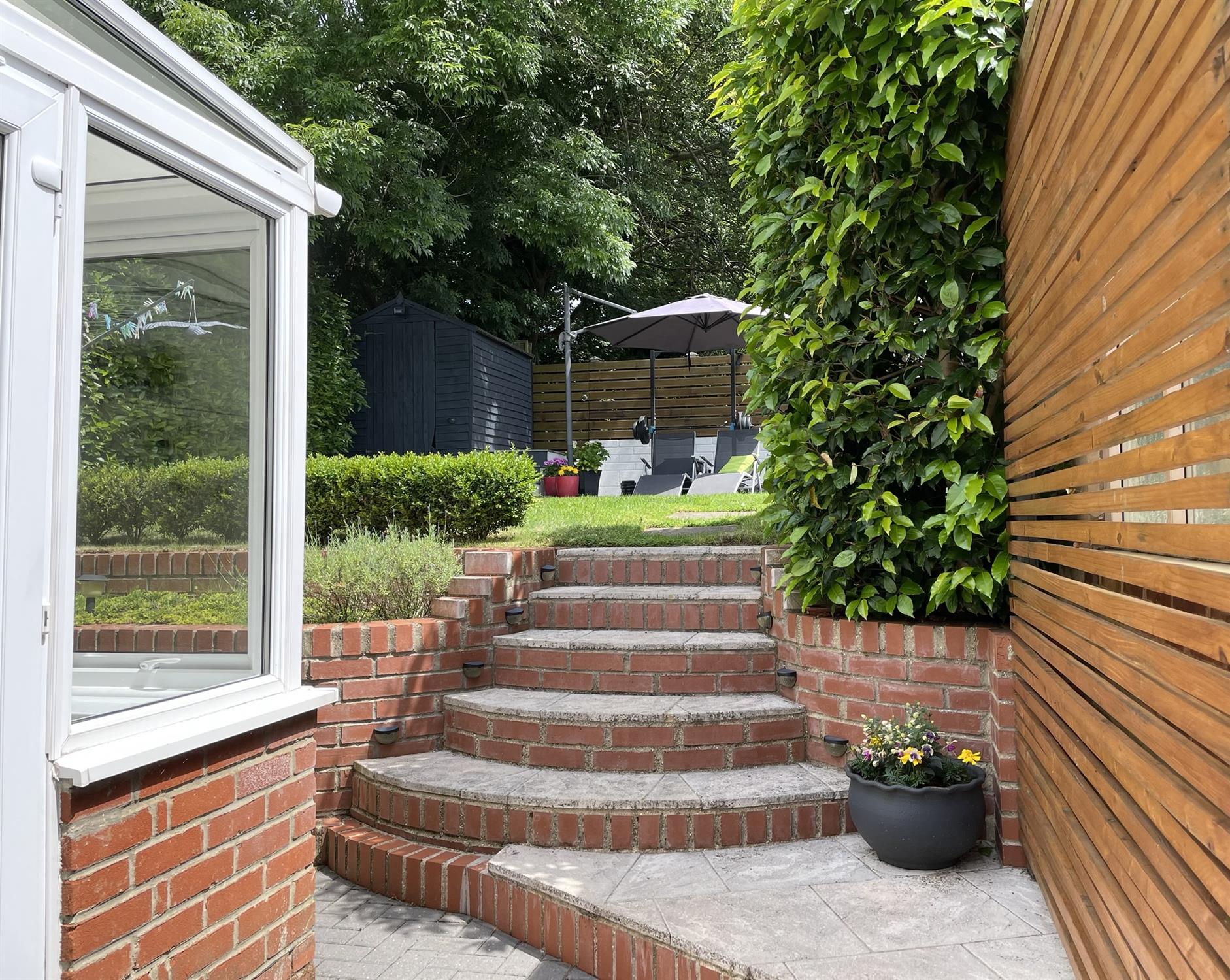 Secure, private and cleverly landscaped rear garden - maximising the space on offer. Brick retaining walls with flower beds inset. Steps to spacious lawned tier with mature hedges to side. Shed. Outside tap.