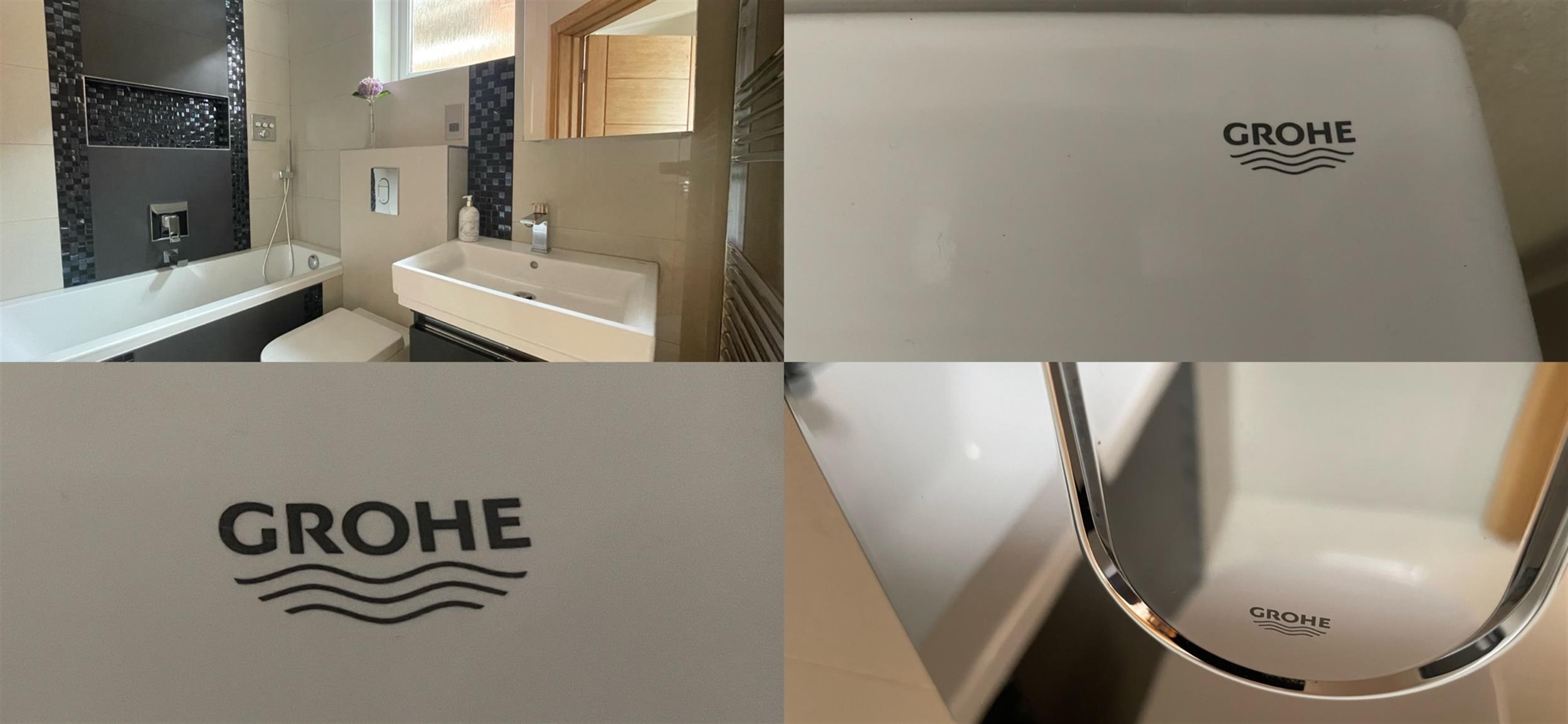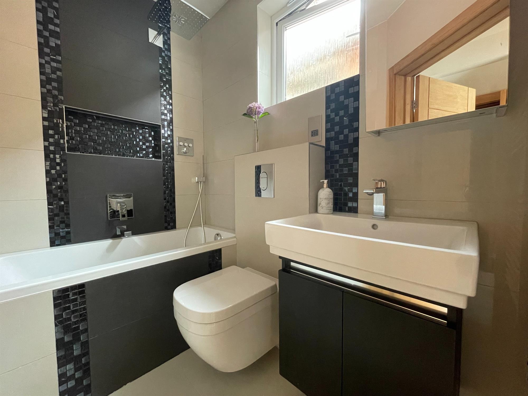 Smooth ceiling with inset spotlights, UPVC double glazed obscured glass window to side. Modern suite consists of WC, wash hand basin and enclosed bath with rainfall style shower over, centralised taps and recessed storage shelving. "GROHE" fittings throughout.