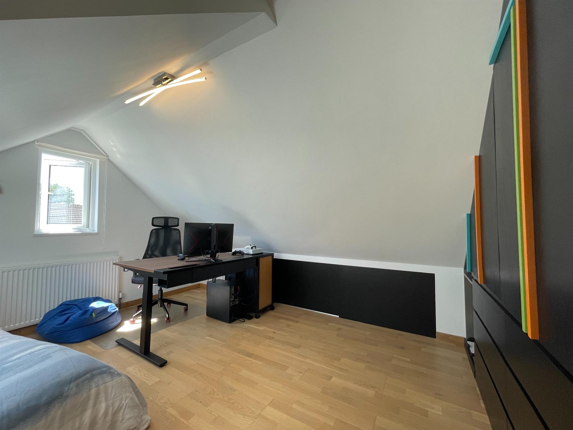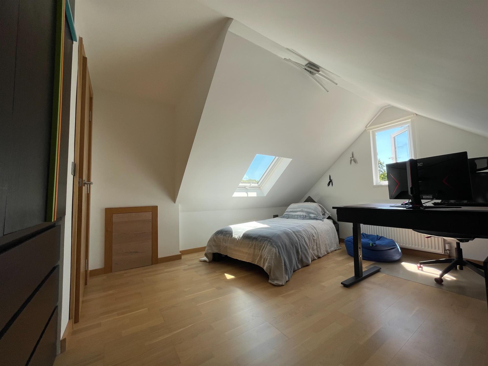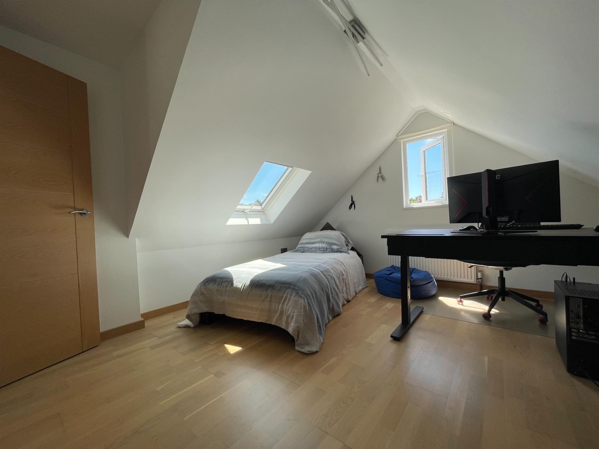 Smooth ceiling, UPVC double glazed Velux style window to side, UPVC double glazed window to rear overlooking garden. Fitted storage and access to eaves. Radiator.