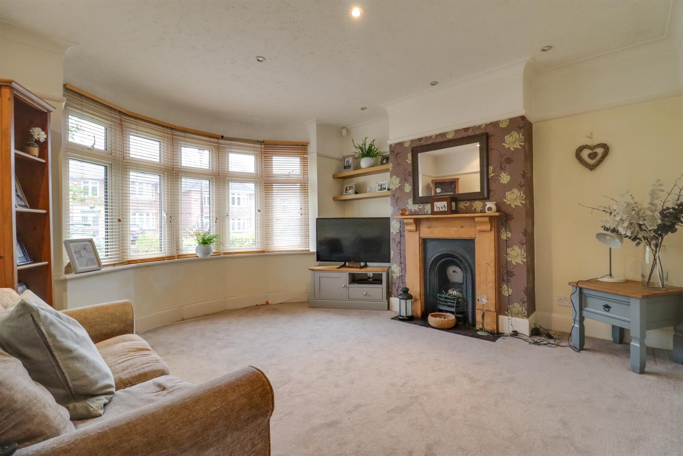 Cast iron fireplace with solid wood mantle piece, bay window with UPVC double windows to front aspect, downward spotlighting, sockets, TV aerial point, one radiator, picture railings.