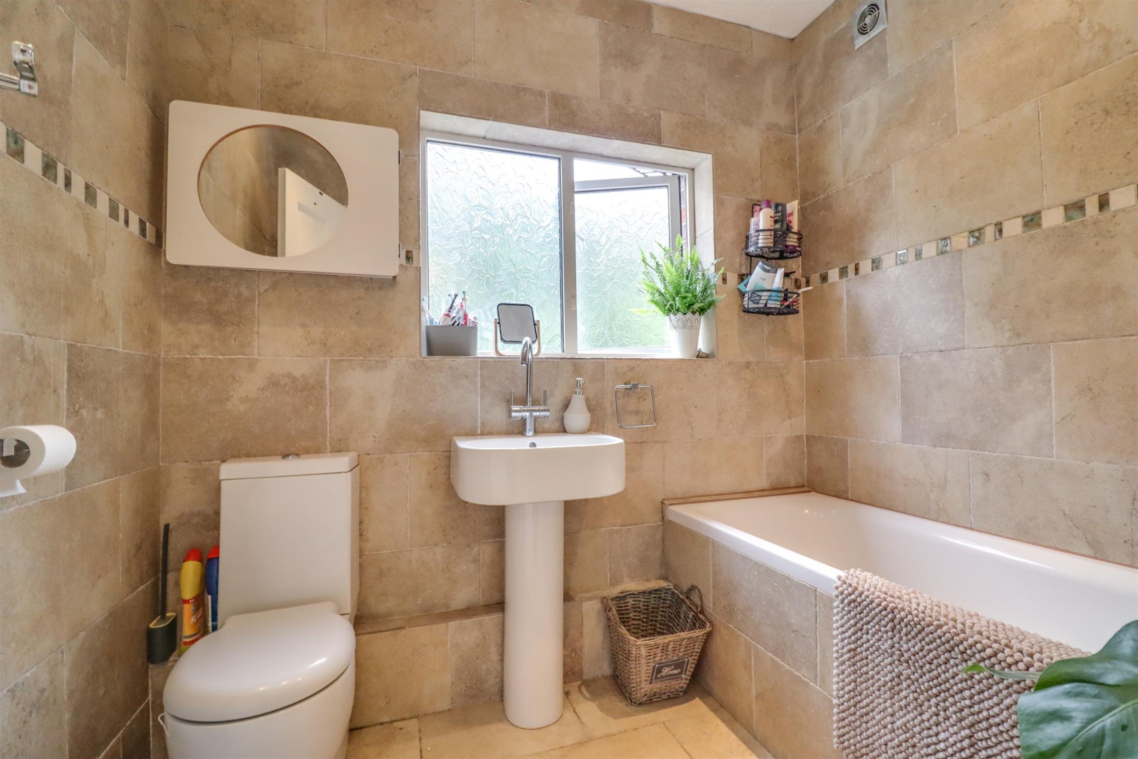 Fully tiled walls and flooring tiled in contrast, chrome heated towel rail, bathtub, overhead shower and tri-folding glass shower screen, basin, WC, extractor and one UPVC double glazed window to rear.