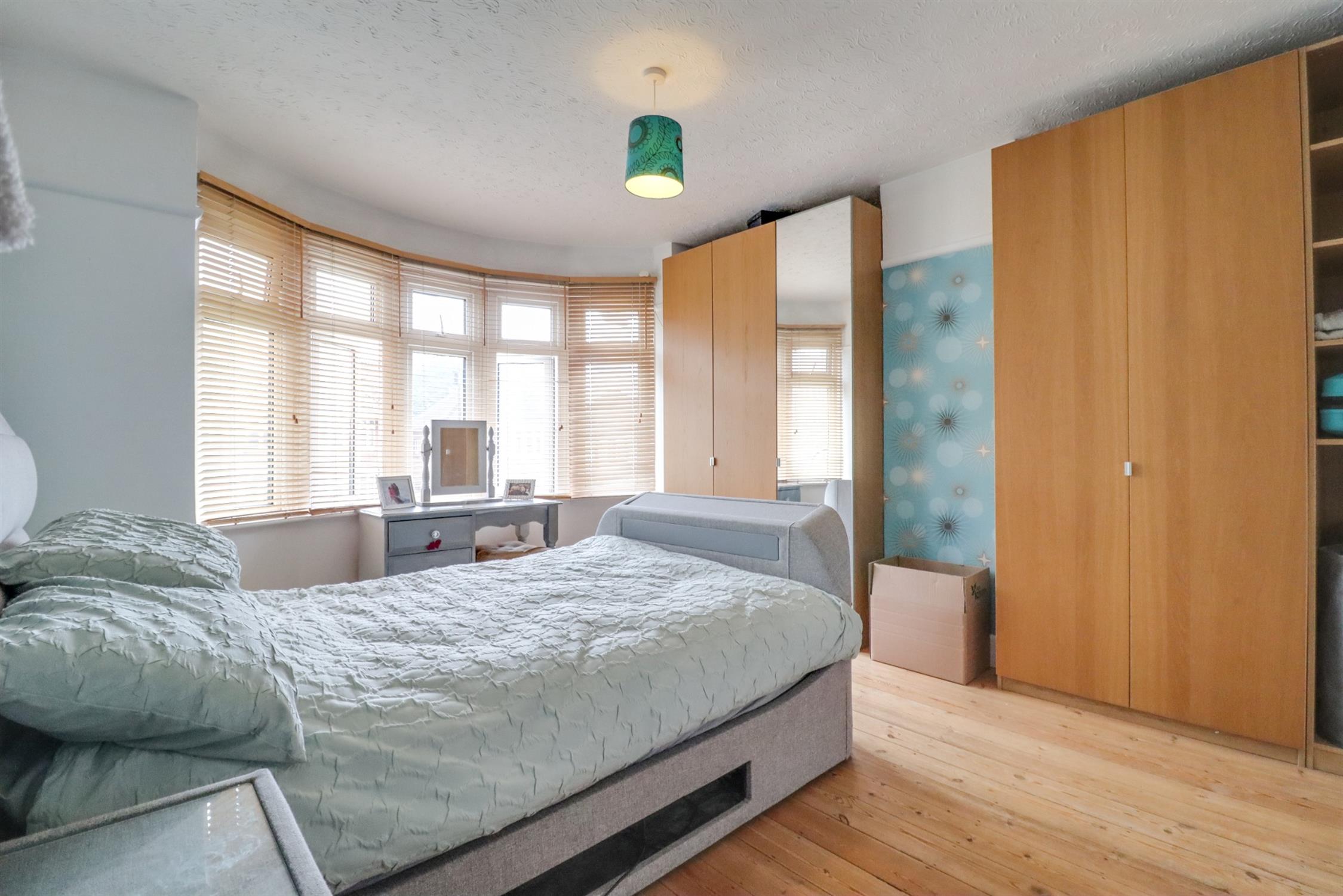 Bay window with double glazed UPVC units, picture railings, exposed varnished wood floorboards, sockets and one radiator, built in wardrobes.