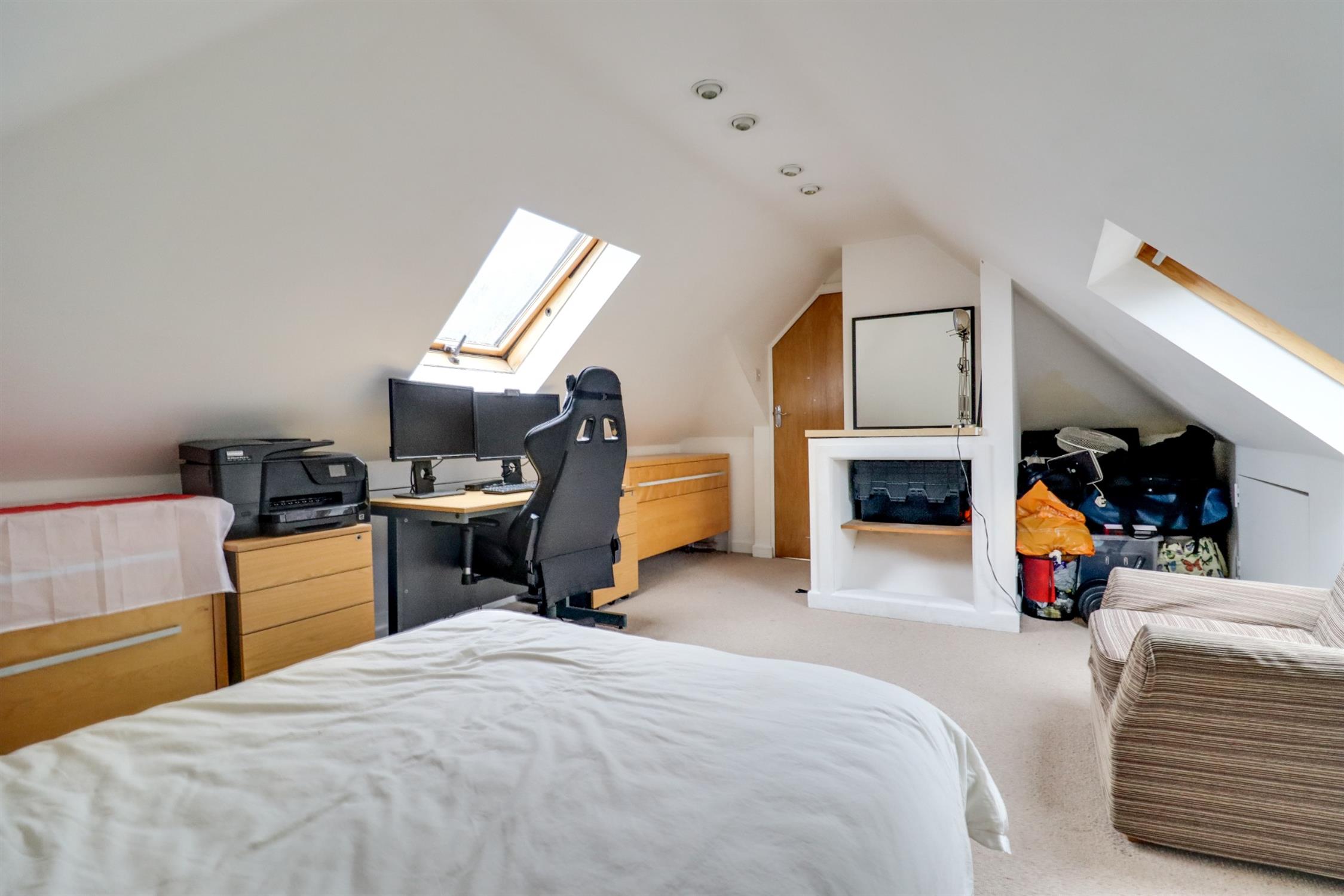 Stairs up to loft conversion with Velux double glazed windows with inset pull out blackout blinds, eaves storage on both sides of roof pitch, smooth ceilings, spotlights and sockets.