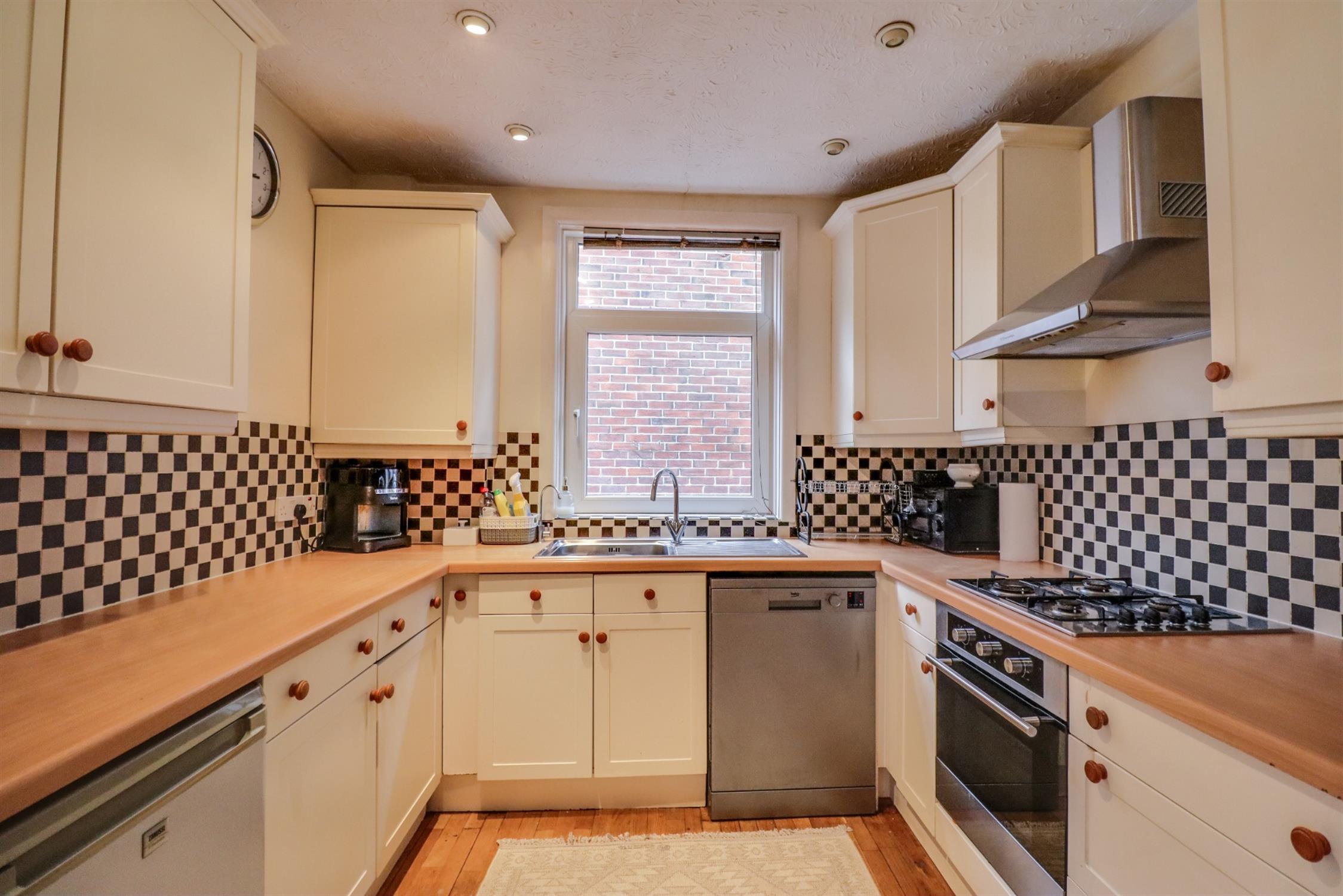 Shaker style kitchen with a range of wall, base and drawer units, integral oven, inset four ring gas hob, overhead extractor, space for dishwasher & fridge/freezer, stainless steel sink and drainer, wall tile in principal areas, engineered wood floor, one double glazed window to side.