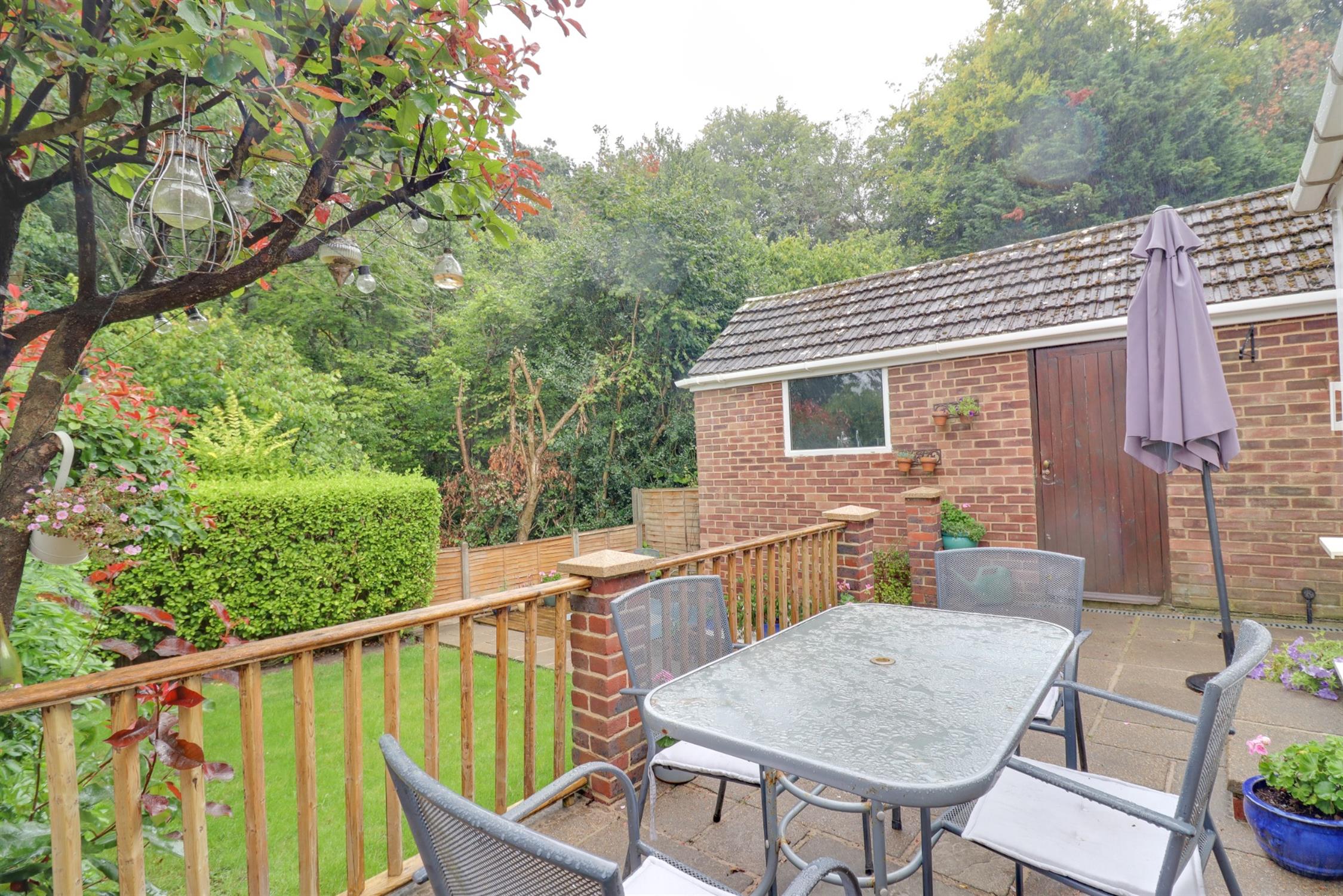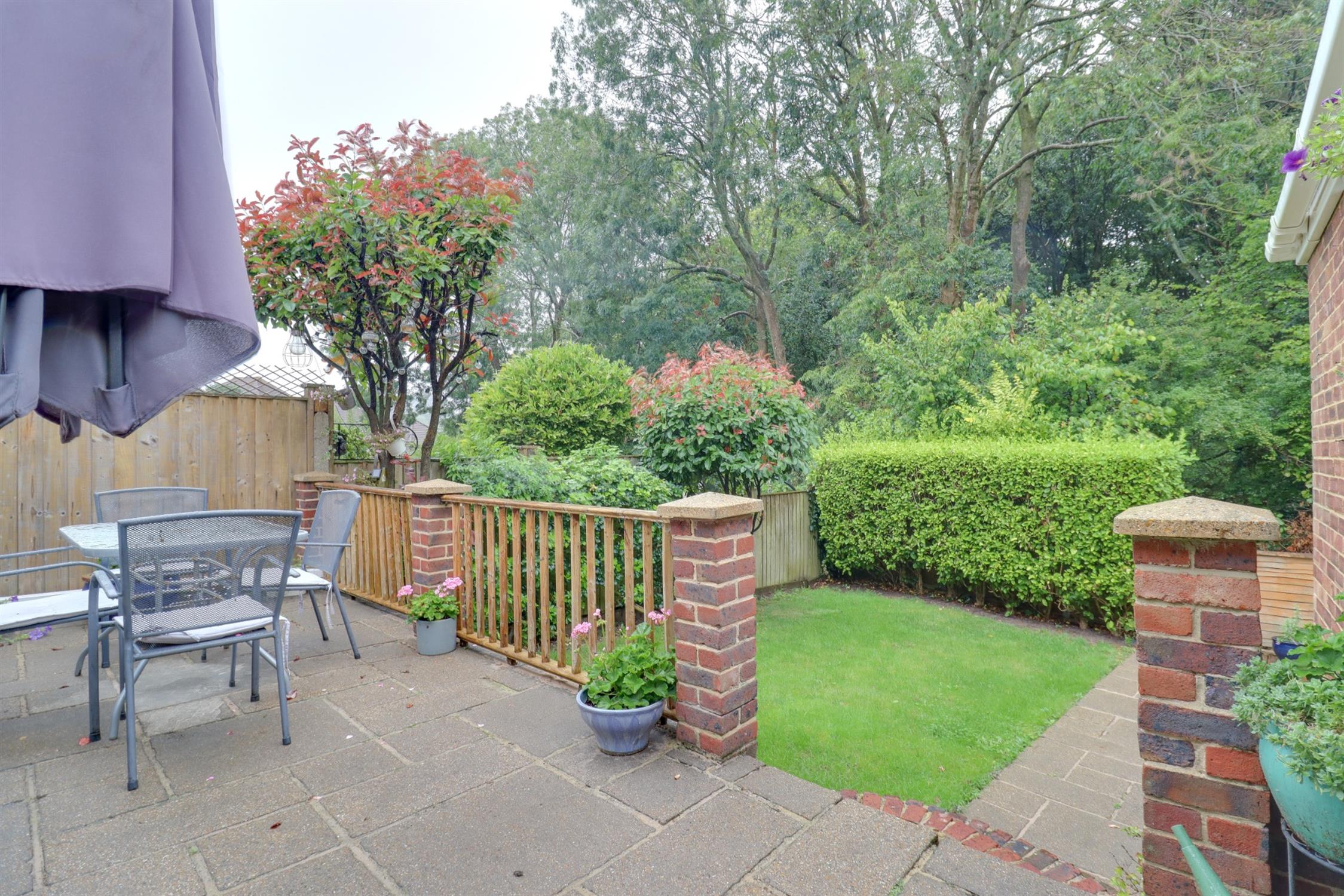 Mainly laid to lawn with mature shrub borders, raised decked seating area and patio seating area.