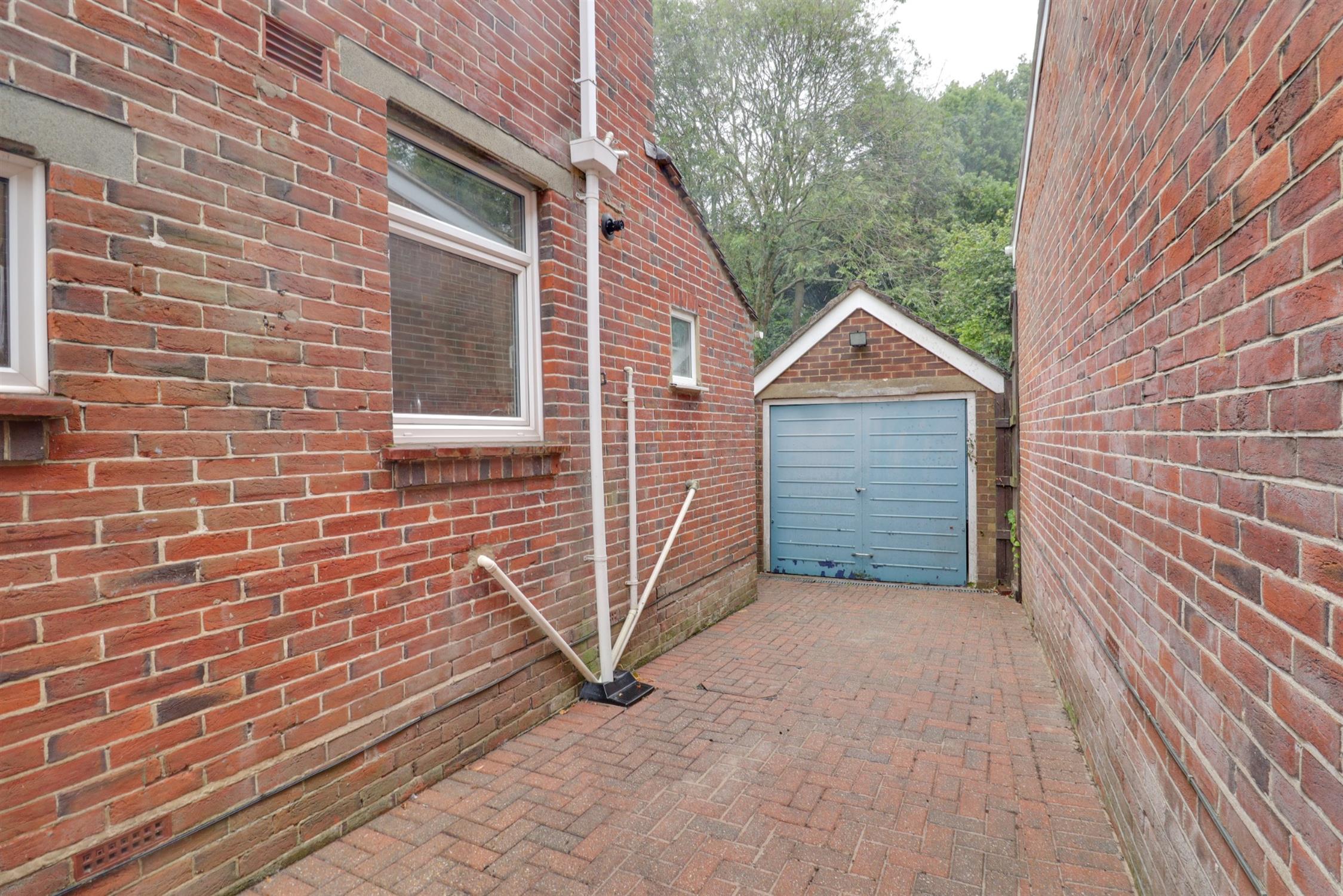 Low level brick wall border, dropped kerb leading to a block paved driveway, lawn with mature shrub borders, access to garage.