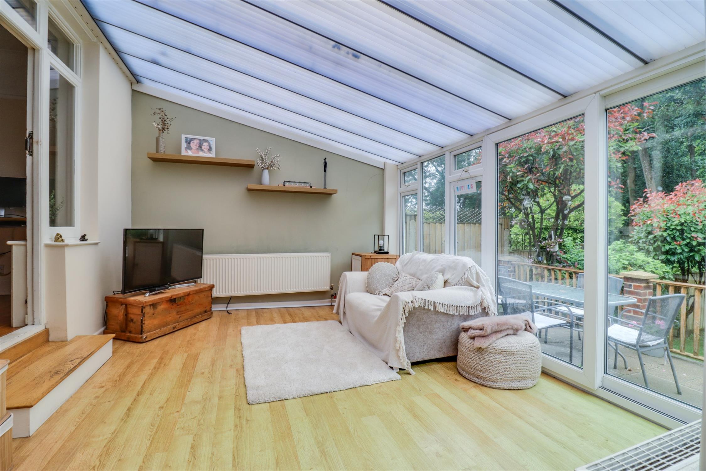 UPVC double glazed windows across the rear with sliding patio door and additional external door, polycarbonate roof, access to WC and utility cupboard, sockets and two radiators.