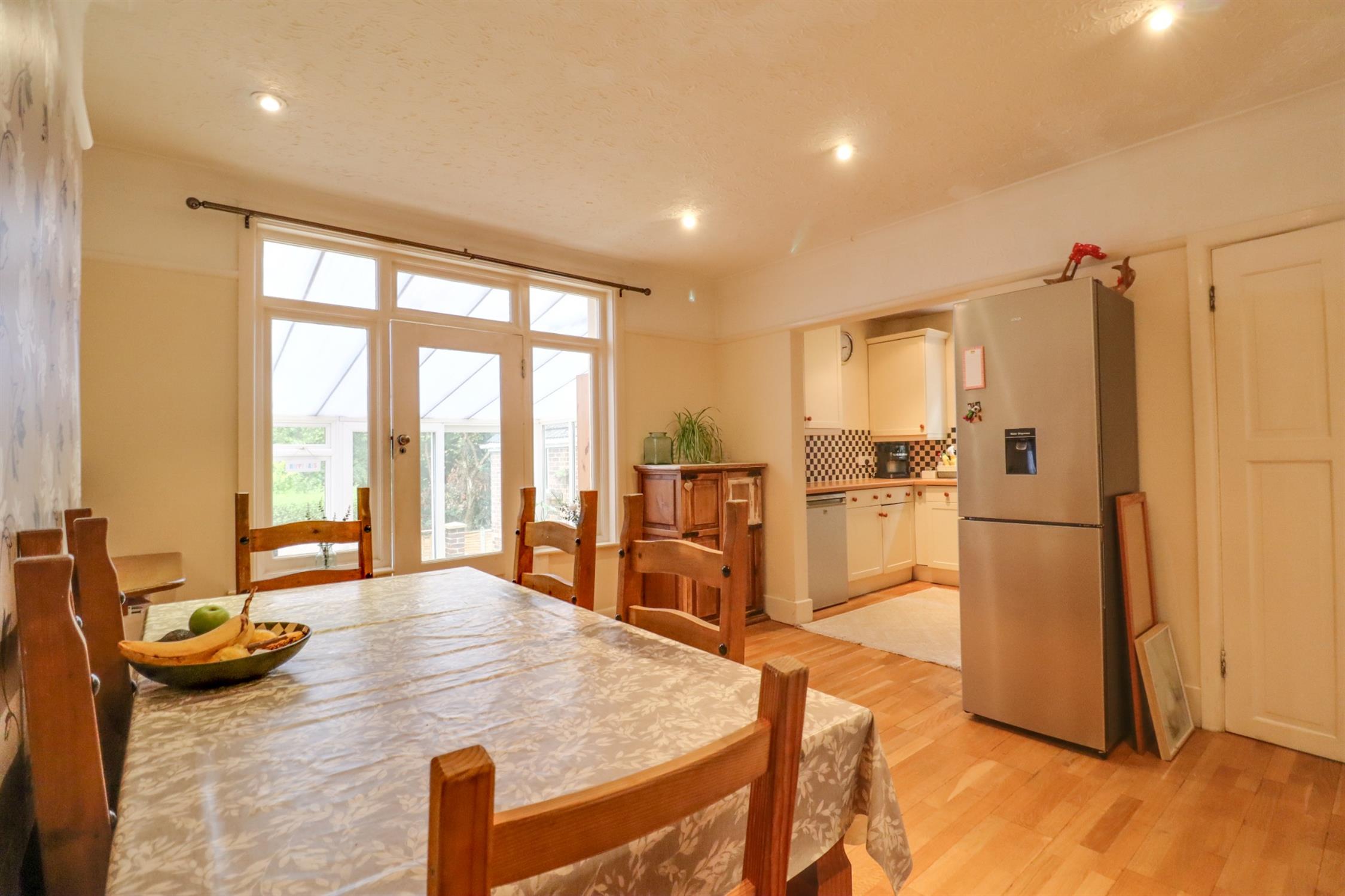 Engineered wood flooring, windows and door to rear out to sun room, picture railings, sockets, downward spotlighting, opening to: