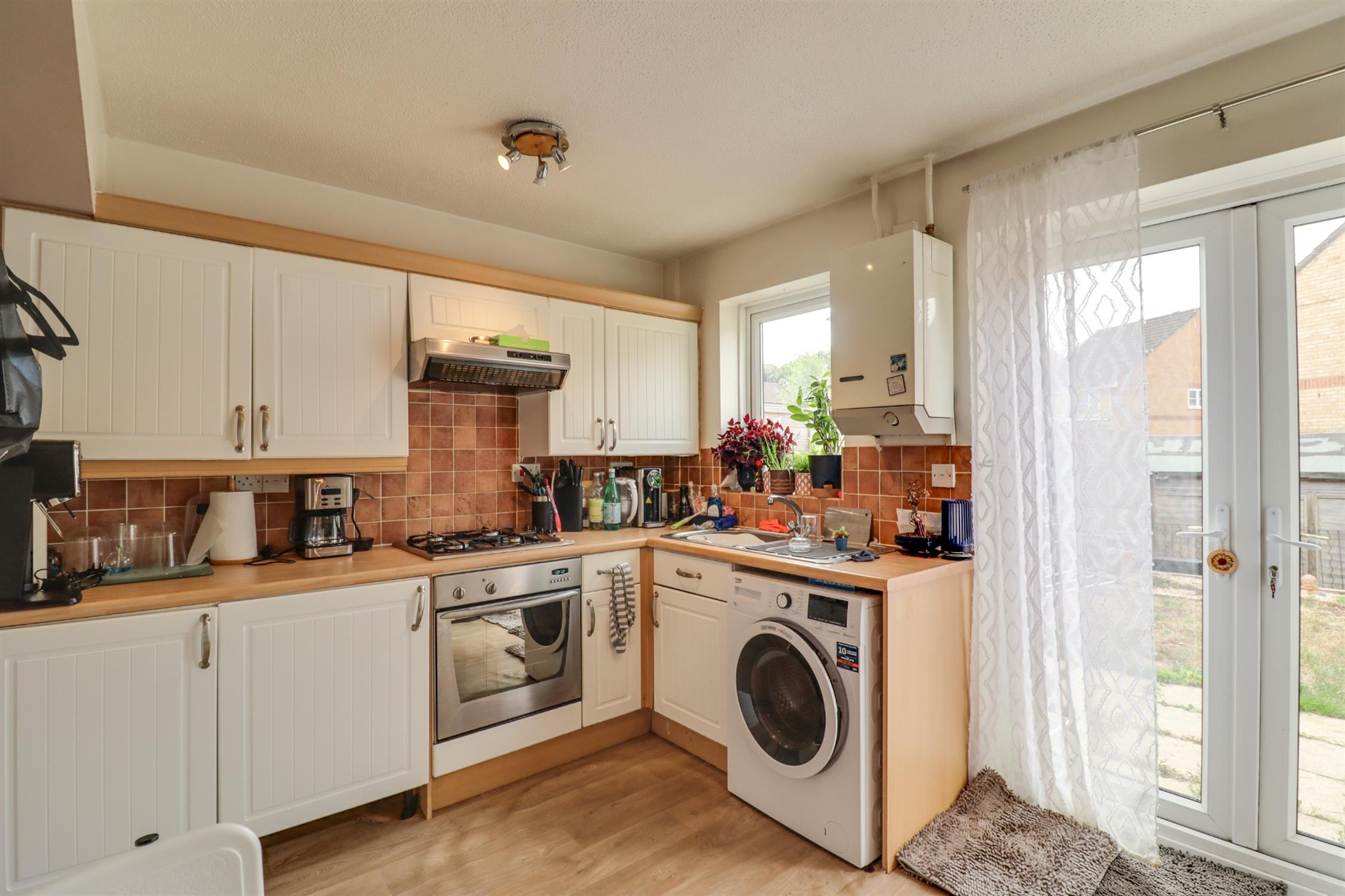 Textured finish to ceiling, double glazed French doors to side, double glazed window to side, a range of wall, base and drawer units with extractor and work surface over, sink and drainer inset, built in cooker with gas hob and electric fan oven, space and plumbing for washing machine, tiled splashbacks, wall-mounted boiler.