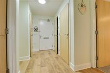 Smooth finish to ceiling, door to front elevation, three large storage cupboards, intercom, radiator, laminate flooring, doors to: