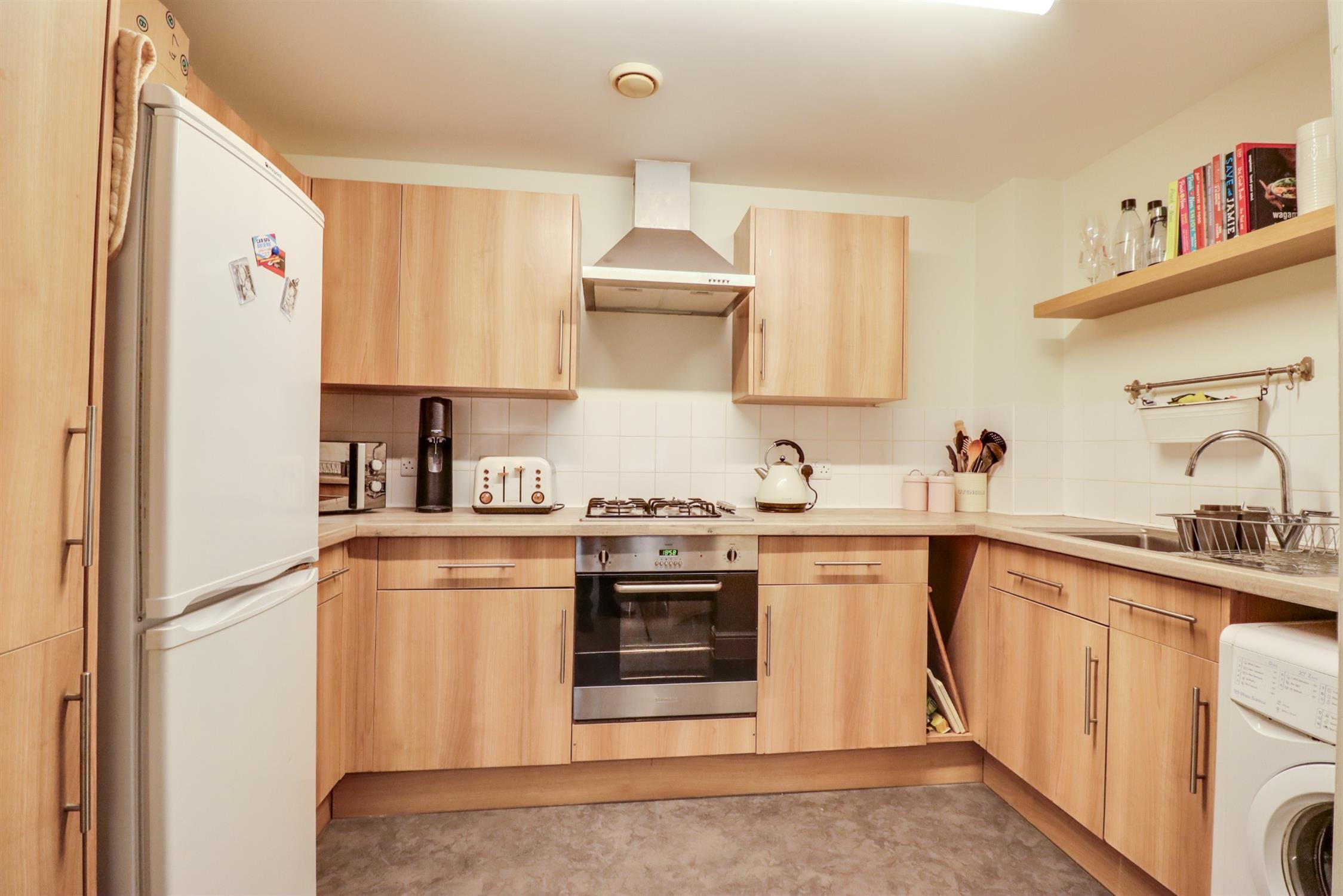 Smooth finish to ceiling, range of matching wall base and drawer units with roll top work surface over, stainless steel sink and drainer inset, integrated oven and hob with extractor fan over, space for fridge/freezer and washing machine, wall mounted combi boiler, tiled splashbacks.