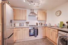 Smooth finish to ceiling, range of matching wall base and drawer units with roll top work surface over, stainless steel sink and drainer inset, integrated oven and hob with extractor fan over, space for fridge/freezer and washing machine, wall mounted combi boiler, tiled splashbacks.