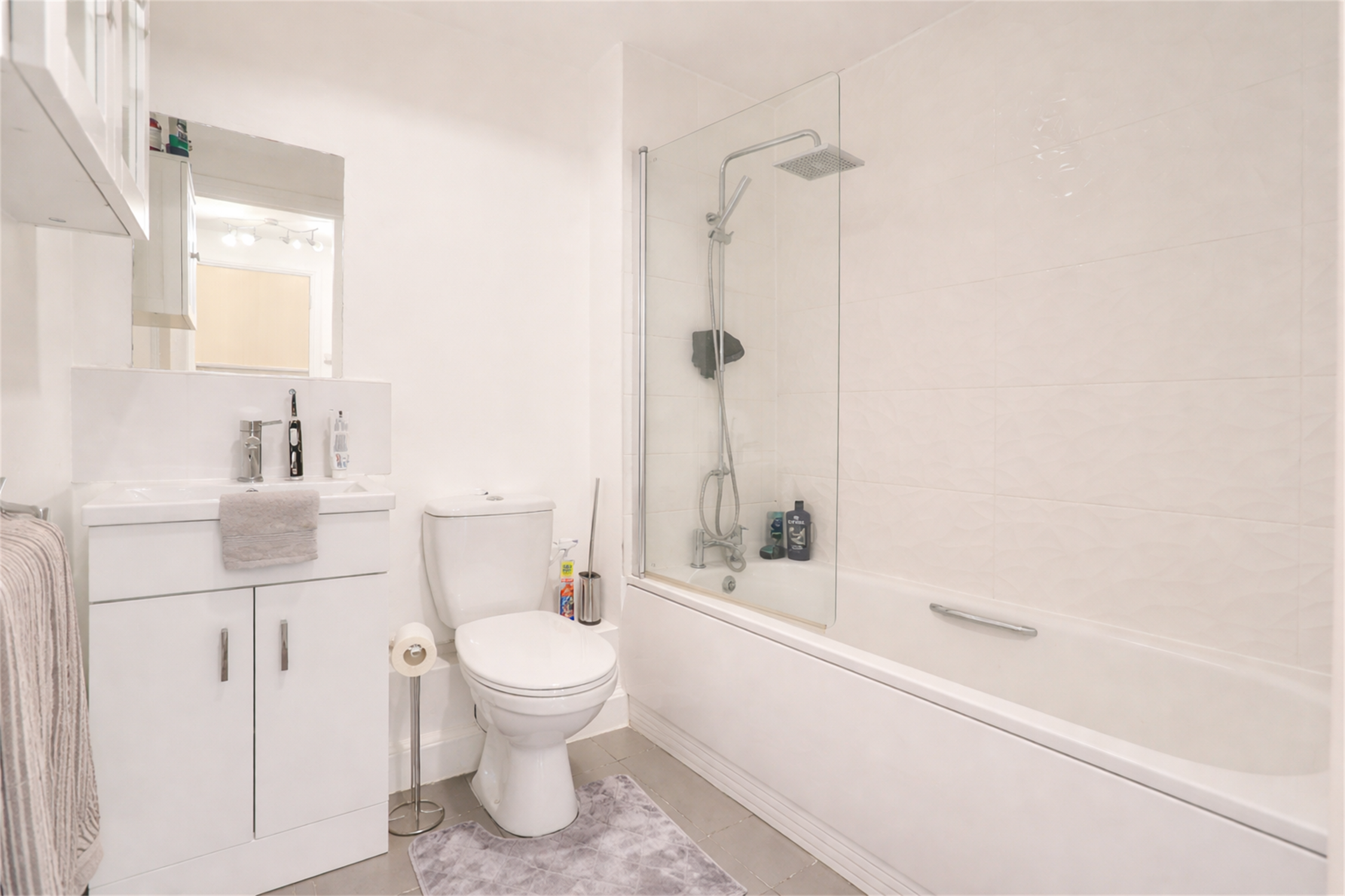 Smooth finish to ceiling, panel enclosed bath with shower attachment over, vanity wash hand basin and low level WC, heated ladder towel rail, tiling to principle areas and flooring.