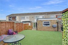 Enclosed rear garden, block paved seating area with steps leading to a generous area of artifical lawn, gate to rear.