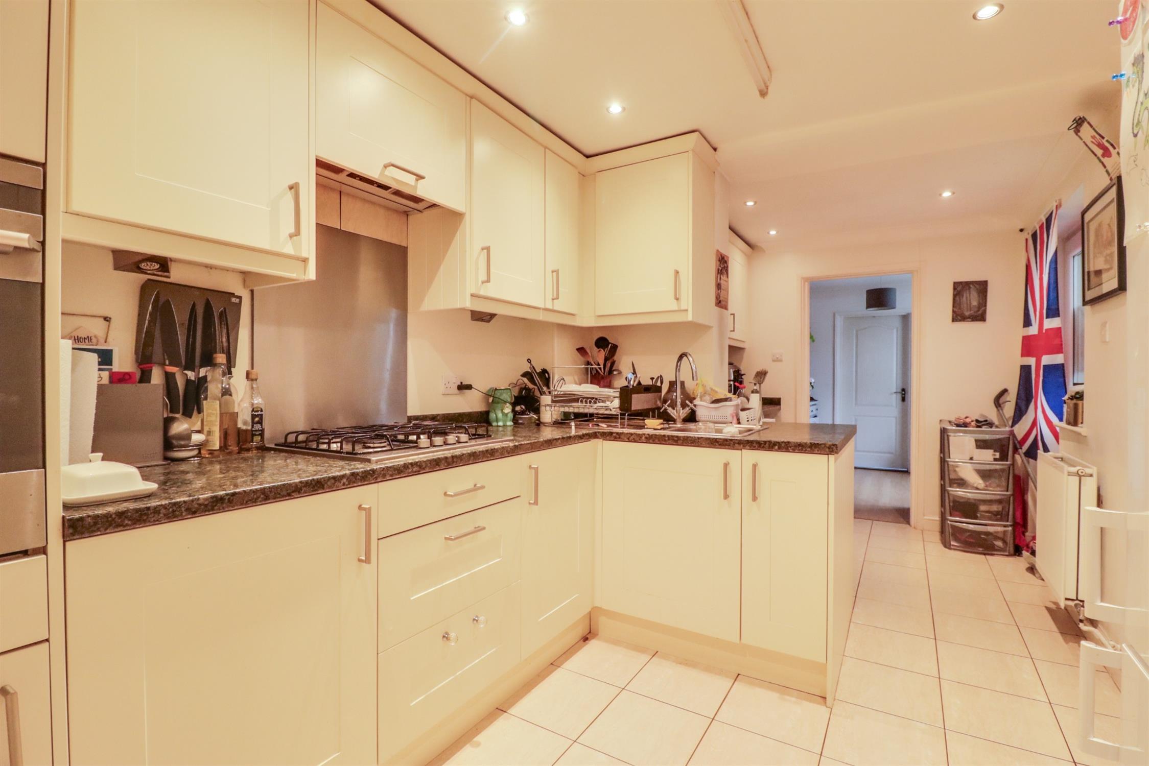 Smooth finish to ceiling with inset spotlights, double glazed window to side elevation, range of matching wall base and drawer units with roll top work surface, integrated oven and hob with extractor fan over, stainless steel sink and drainer inset, space for appliances, radiator, tiled flooring, doors to: